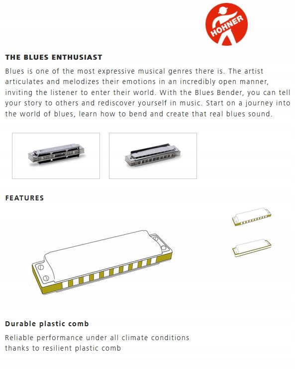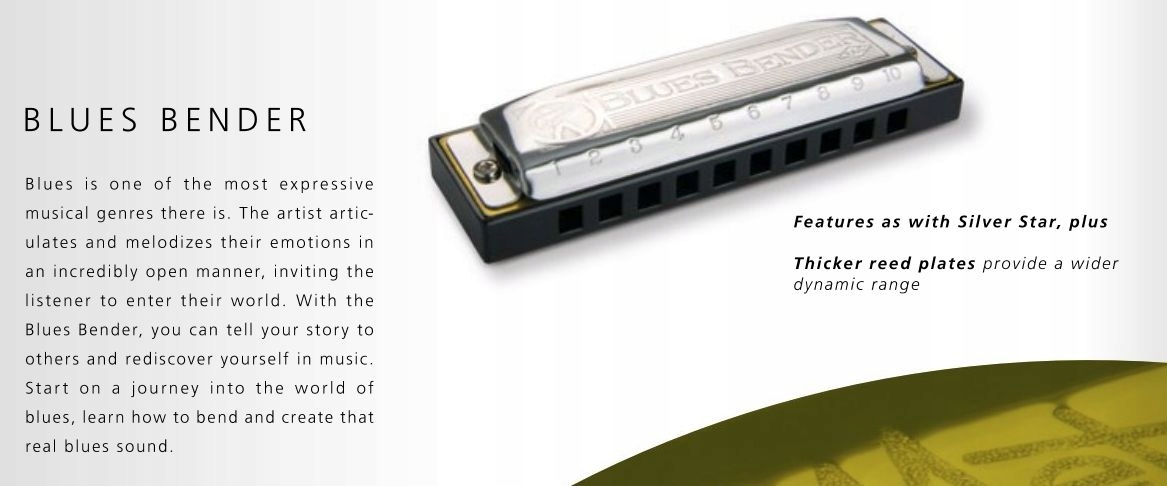 Обычно блюзовая диатоническая губная гармошка Blues Bender — идеальный выбор как для начинающих, так и для опытных игроков на губной гармошке. Если вы хотите отразить глубину своих эмоций в создаваемой вами музыке, Blues Bender станет для вас идеальным выбором.