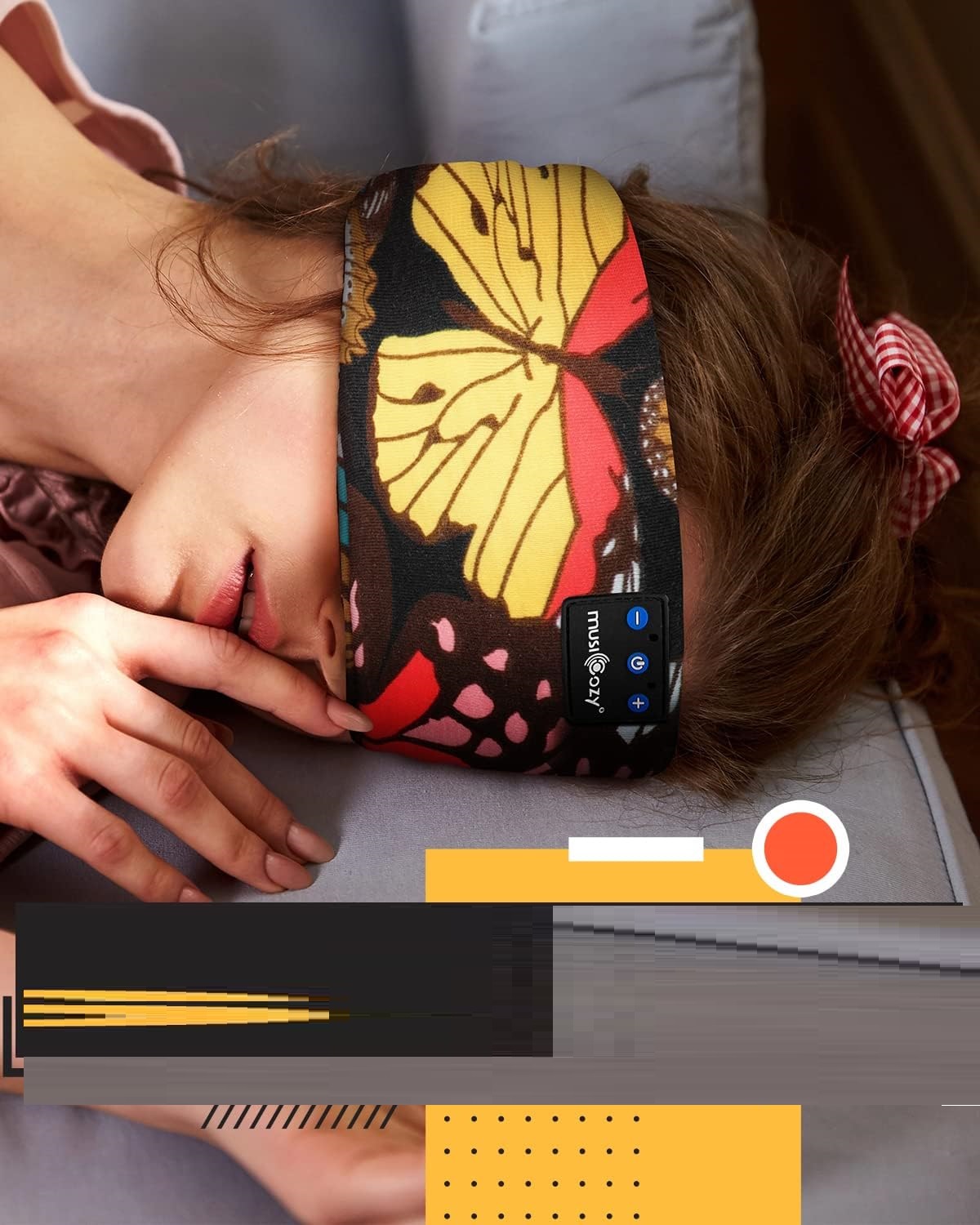 Musicose Наушники сочетают в себе три функции - наушники Bluetooth, мягкая спящая маска и спортивная повязка на голову. Благодаря эластичной и дышащей ткани, группа идеально прилипает к голове, не скользя вниз во время сна, бега, йоги или медитации. Идеально подходит для путешествий, тренировок и расслабления.