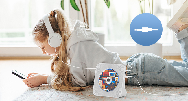 - Проводной динамик: подключите проигрыватель компакт-дисков к другим внешним проводным устройствам, таким как мобильные телефоны, планшеты или ноутбуки, с помощью аудиокабеля 3,5 мм. Он работает как проводной динамик. С помощью этого аудиокабеля вы можете подключить проигрыватель компакт-дисков к другим внешним проводным динамикам и воспроизводить его (Совет: в комплект пульта дистанционного управления не входят батарейки)