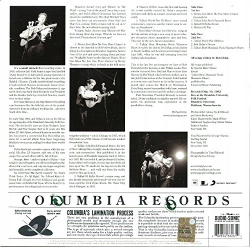 Виниловое издание песни "Bob Dylan In Concert: Университет Брандейса" 1963», в котором записано последнее живое выступление Боба Дилана перед тем, как он стал звездой. В альбом вошли ранее не издававшиеся записи, которые Дилан исполнил на фольклорном фестивале Университета Брандейса 10 мая 1963 года. Уже через несколько недель Дилан появляется на фольклорном фестивале в Ньюпорте, где пользуется впечатляющим успехом и начинается его большая музыкальная карьера.