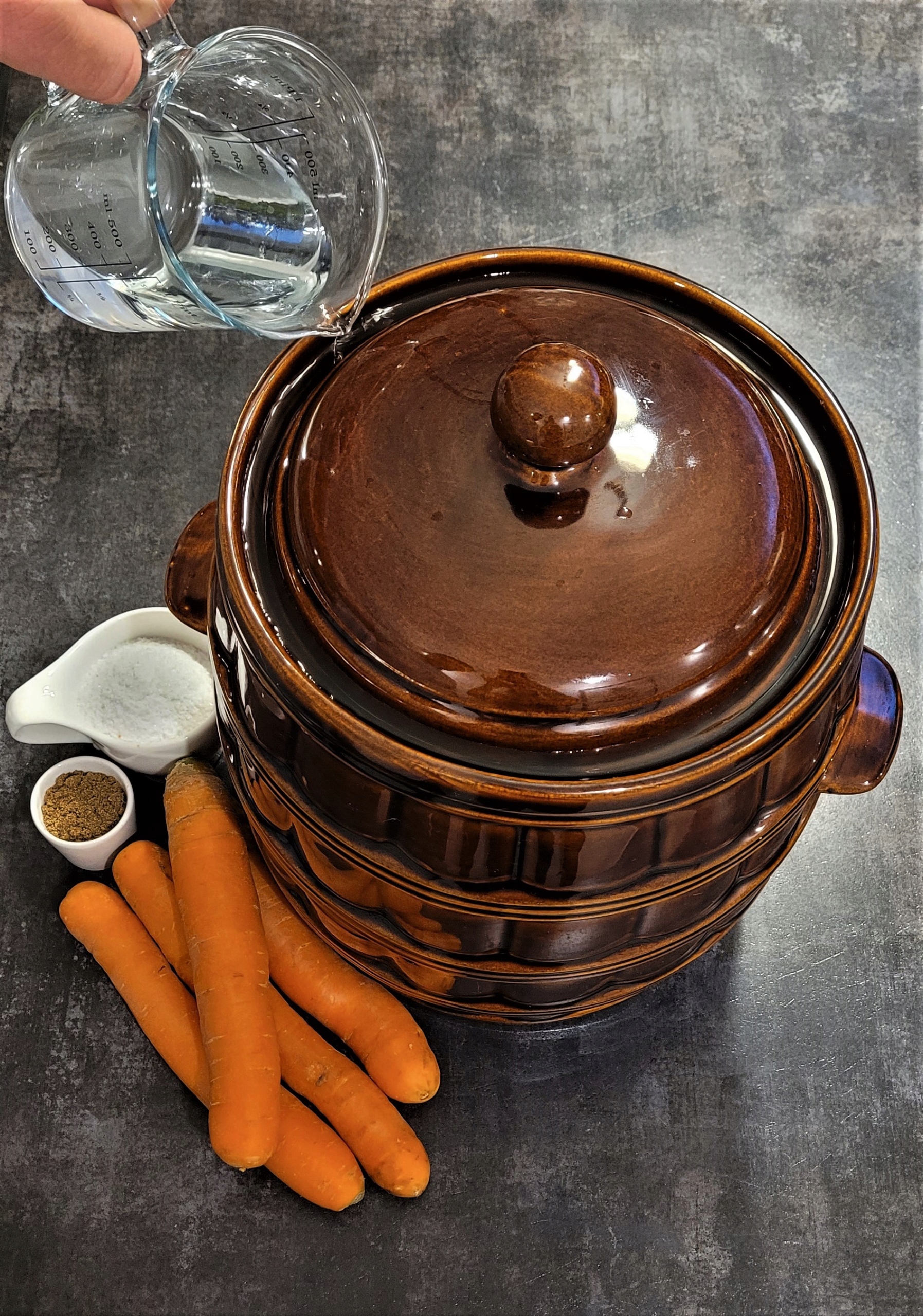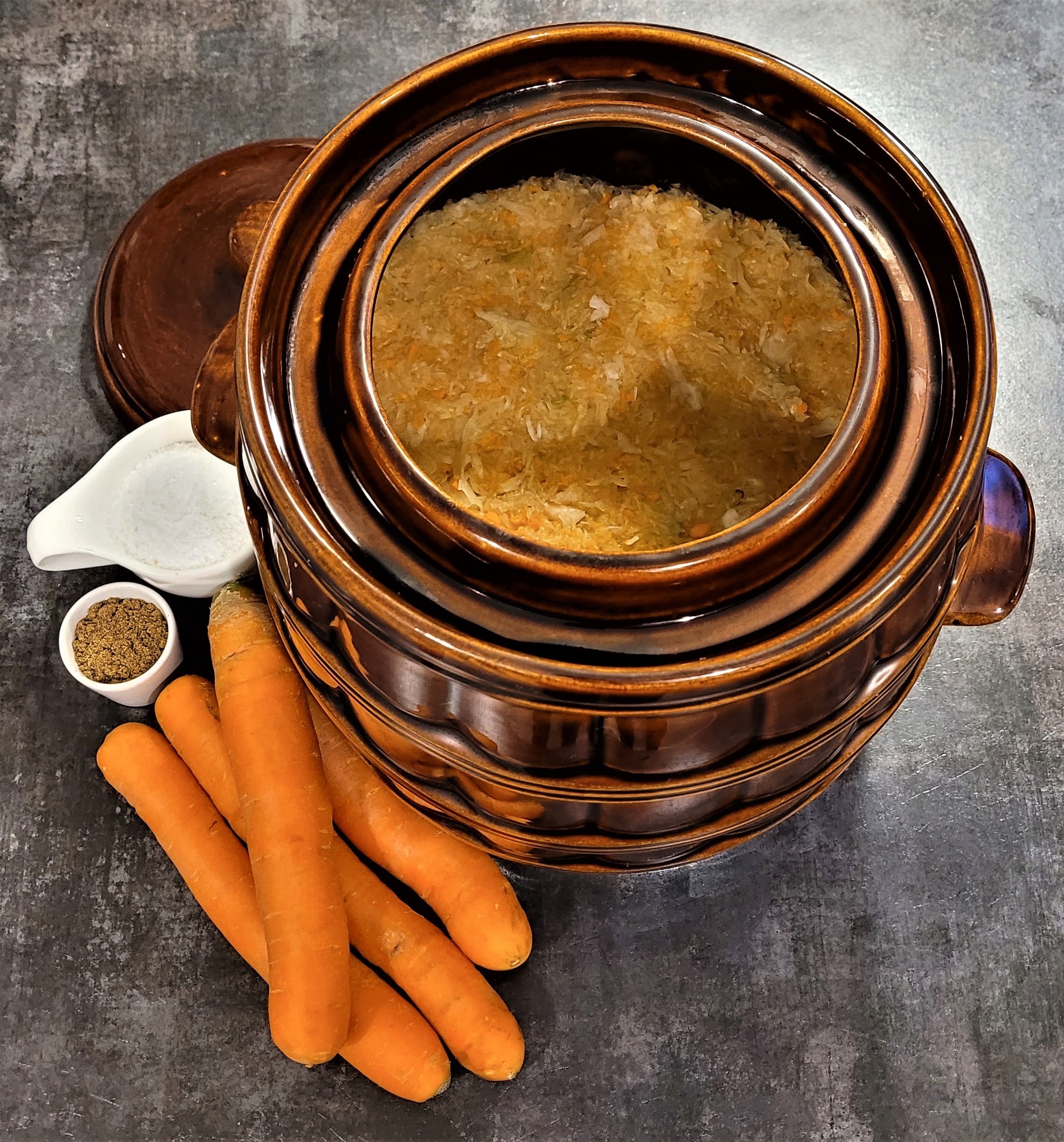 В большую, вымытую миску насыпьте 1/3 пакета нашинкованной капусты, посыпьте частью нашинкованной моркови и немного смеси соли и тмина. Затем добавьте следующие слои и подождите около 20 минут, затем все тщательно перемешайте. В предварительно вымытую глиняную кастрюлю с воротником высыпаем капусту слоями примерно по 10 см и энергично разминаем кулаком или деревянной лопаткой. Когда он заполнится (максимум 5 см от верхнего края), разровняйте поверхность, закройте крышкой и заполните воротник чистой водой.