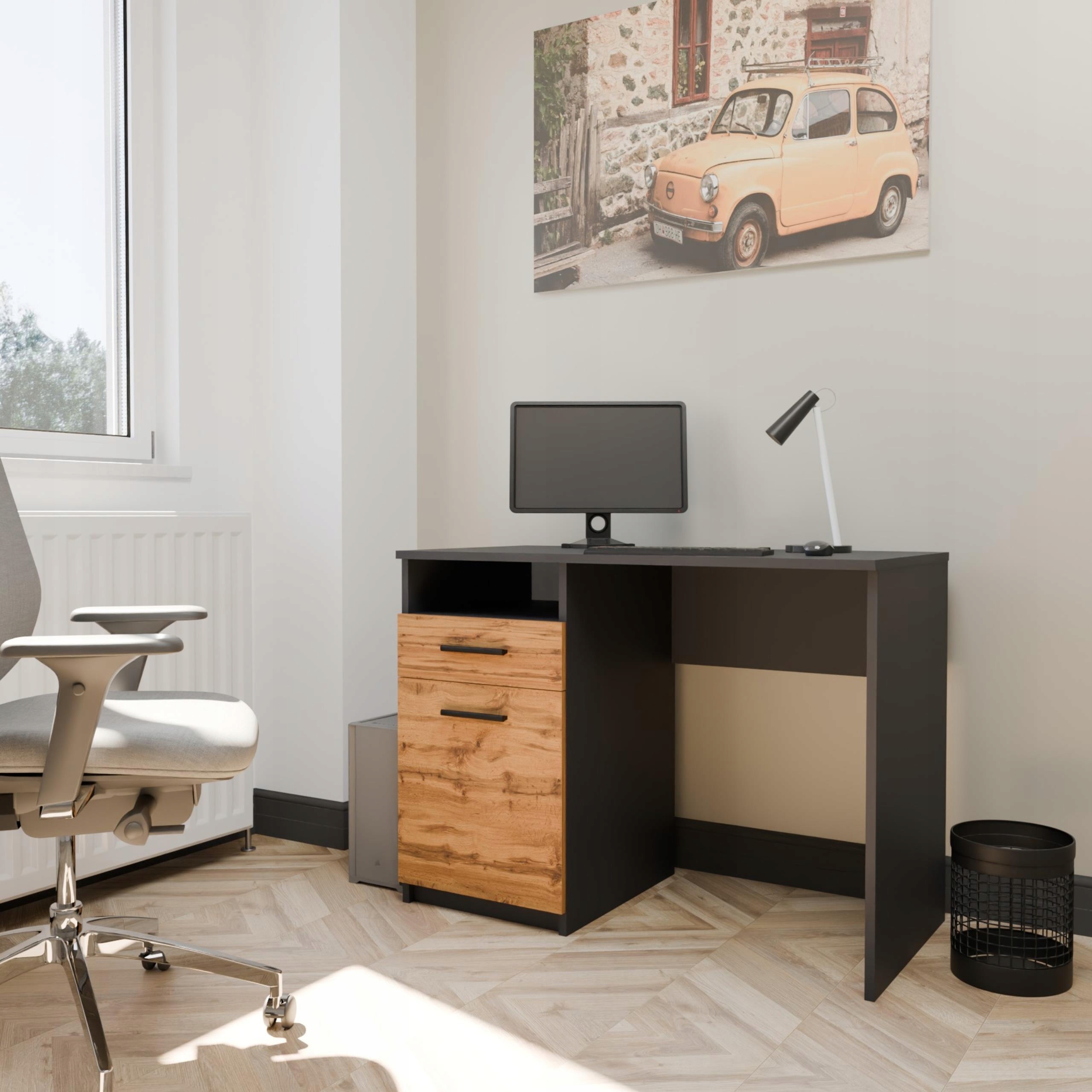 Стол имеет 1 ящик и 1 Шкаф и задняя часть ящика они сделаны из той же тарелки, что и стол, благодаря которой ящик жесткий и долговечный. Двойное монтаж, который дополнительно увеличивает их прочность >