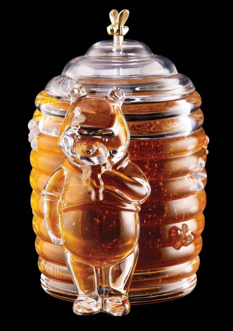 Хрустальный медовик с золотой пчелкой и мишкой (в комплекте с деревянным медовиком) изготовлен из хрусталя высочайшего качества с содержанием PbO 24%. Он идеален в качестве элегантного подарка, поскольку упакован в изящную черную коробку. Контейнер для меда красиво смотрится на столе, на крышке изображена золотая пчела, что делает изделие уникальным.