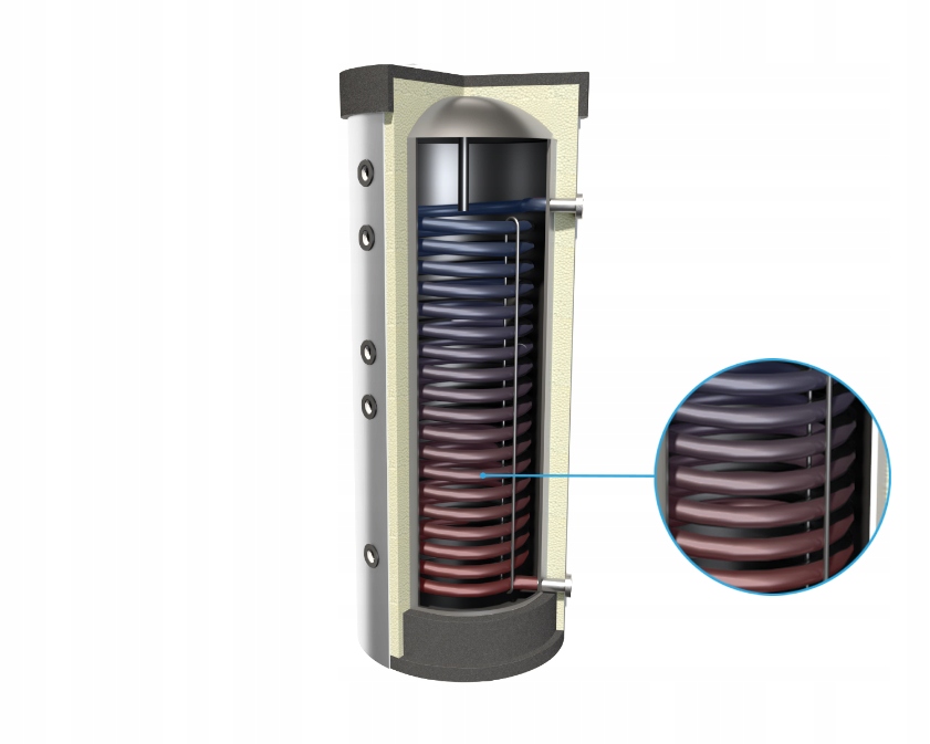 Бак в основном используется для нагрева и хранения горячей воды. Благодаря уникальному змеевику с очень большой поверхностью (до 2,8 м^2) его также можно использовать в качестве буфера или теплообменника. . Также используется в ситуациях, когда мы не хотим заливать всю установку центрального отопления, например, раствором гликоля. Все, что вам нужно сделать, это создать отдельный контур через змеевик, который отдает тепло в центральное отопление. Благодаря очень большому количеству соединений его также можно использовать в качестве гидравлической муфты, когда есть необходимость подключить несколько источников тепла.