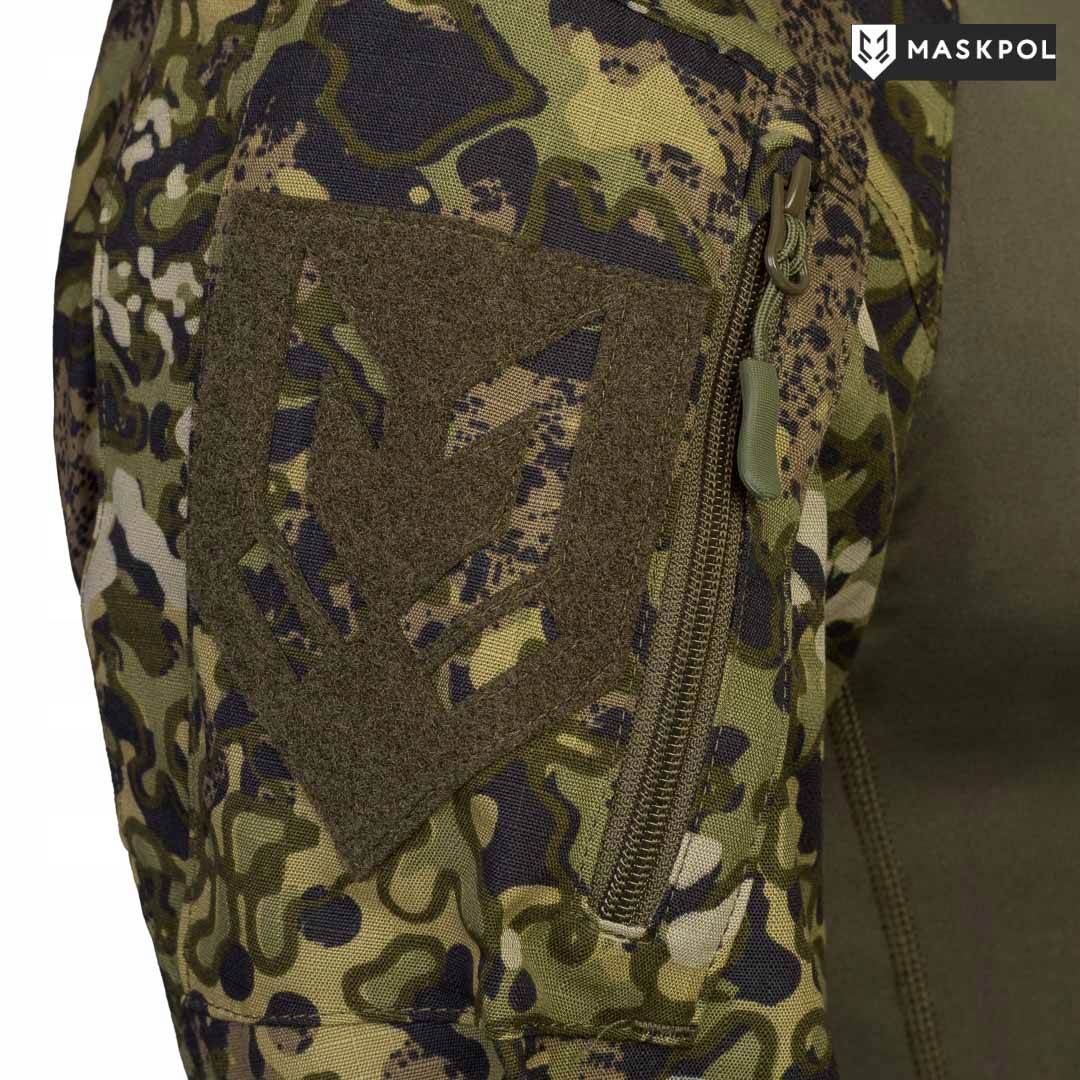 На плечах большие карманы по образцу полевой формы. 2010 Войско Польское. Карманы имеют два сильфона, увеличивающих их вместительность. Карманы закрываются на длинные молнии с уплотнительной планкой внутри. Слайдеры оснащены элементами, облегчающими работу с машинами в перчатках. На карманах имеются большие панели из мягкой липучки для крепления нашивок формирования или нашивок боевого духа и флагов. Застежка-липучка с вырезанным логотипом Maskpol. Внутри правого кармана большая бирка с азбукой Морзе. Две эластичные петли из широкой резины для крепления химического фонаря или ручки.