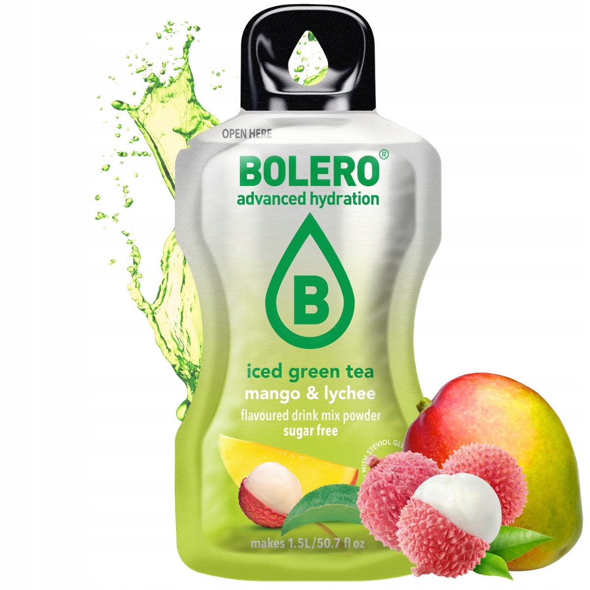 Деликатный вкус зеленого чая в сочетании с фруктовыми экстрактами, заключенными в пакетики с электролитами Болеро. 100% без глютена и сахара.