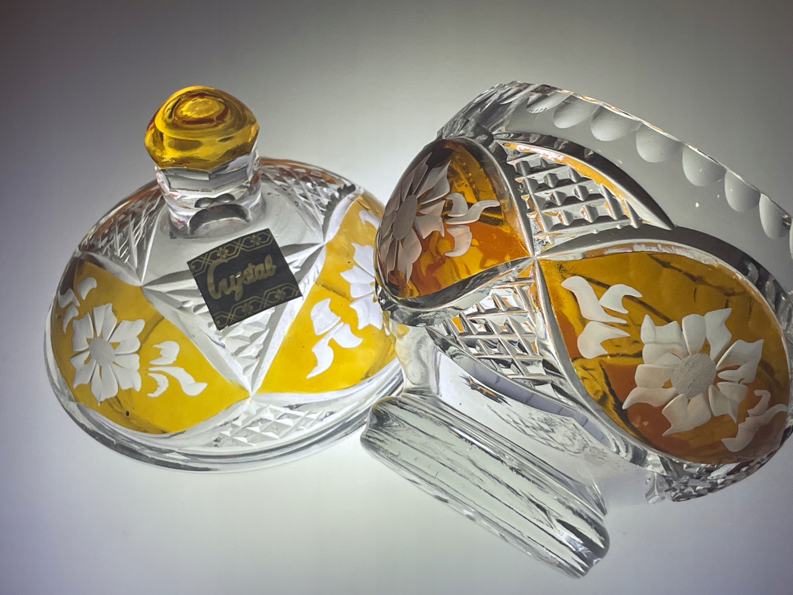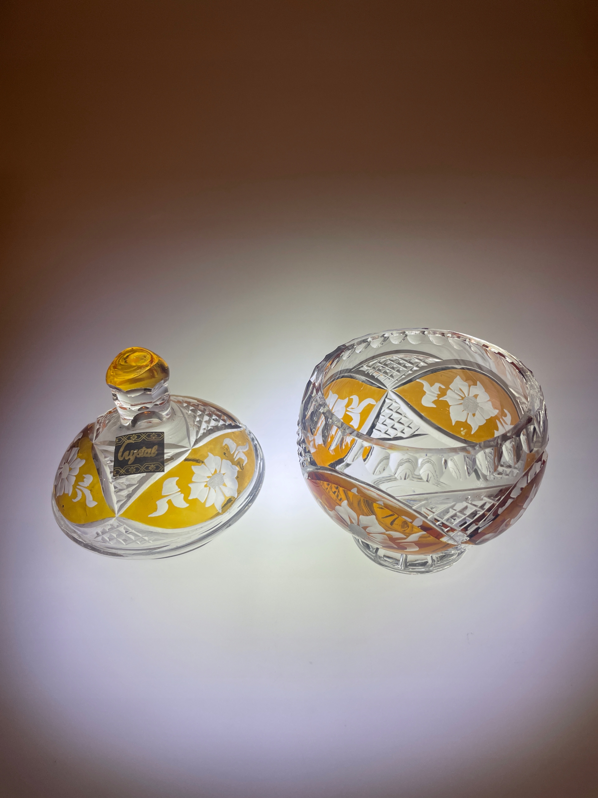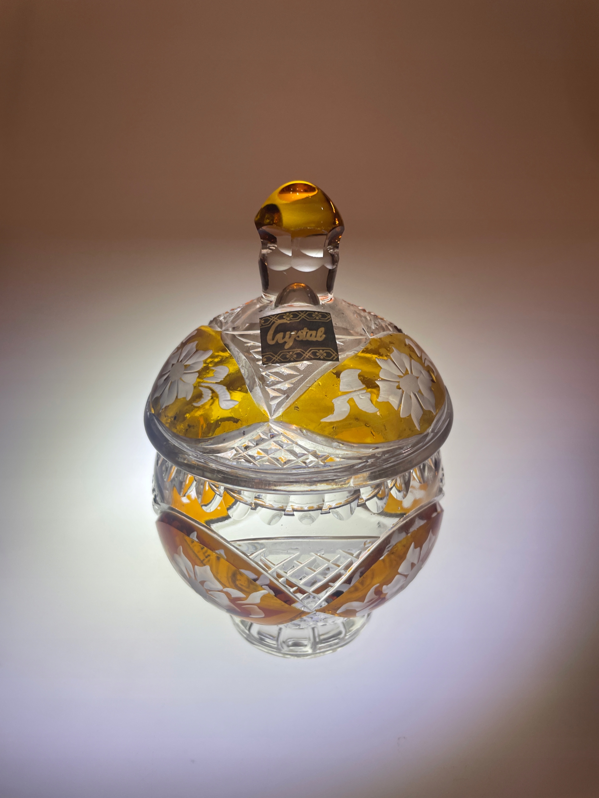 Бомбоньєра глазурований кришталь, медові огранки, квіти ПНР, склозавод Ірена?