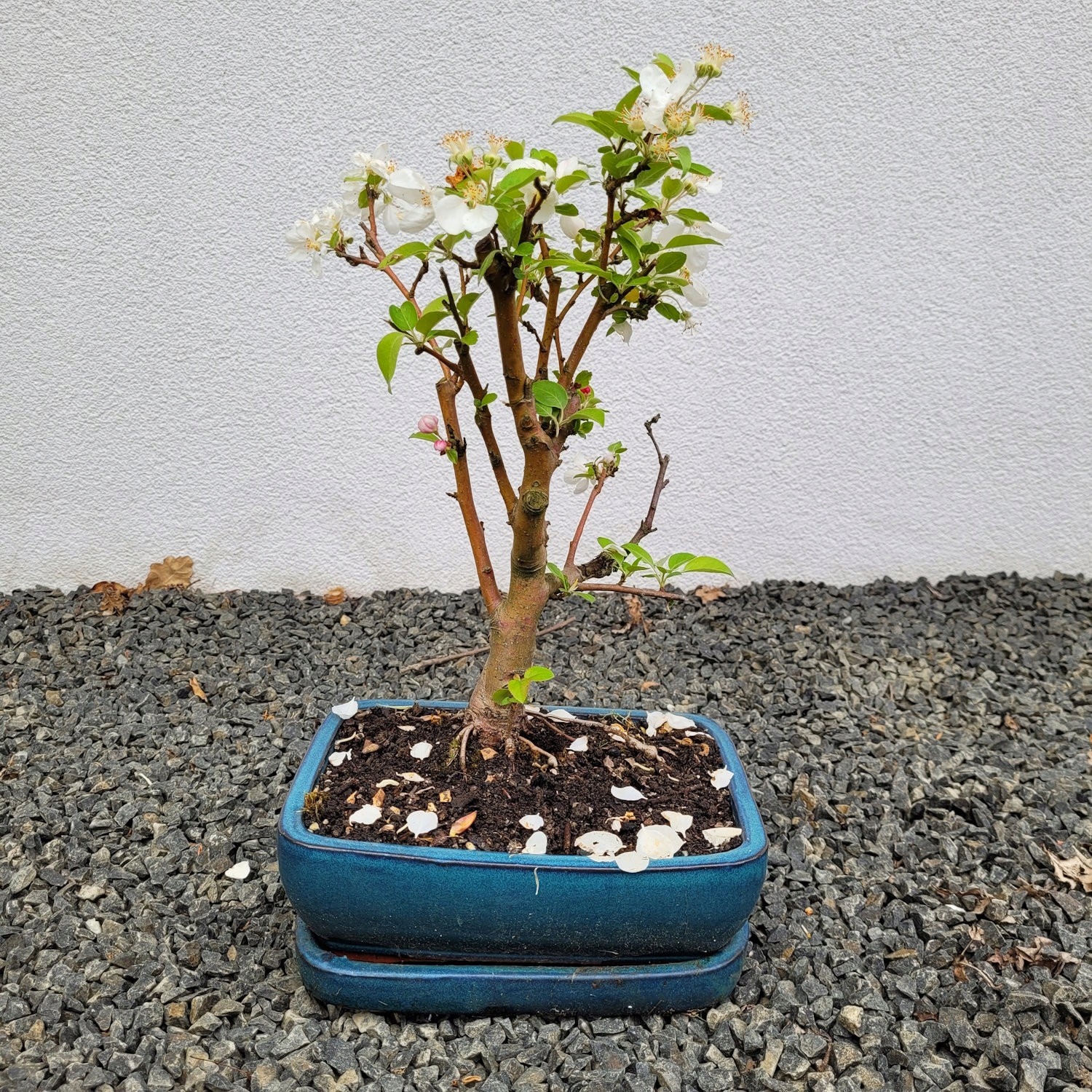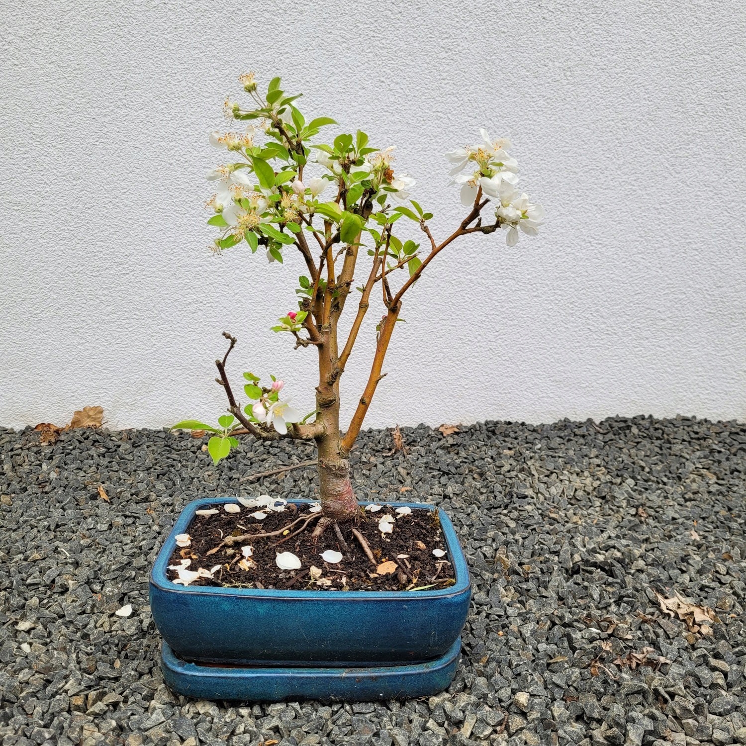 Бонсай - Яблоня. Вид морозоустойчив, но зимой стоит защищать его от ветра и снега. Любит солнечные и полусолнечные места. Лучше всего поливать почву напрямую, а не через листья растения. Подходит для содержания на открытом воздухе. Цветет в мае-июне, плодоносит летом.