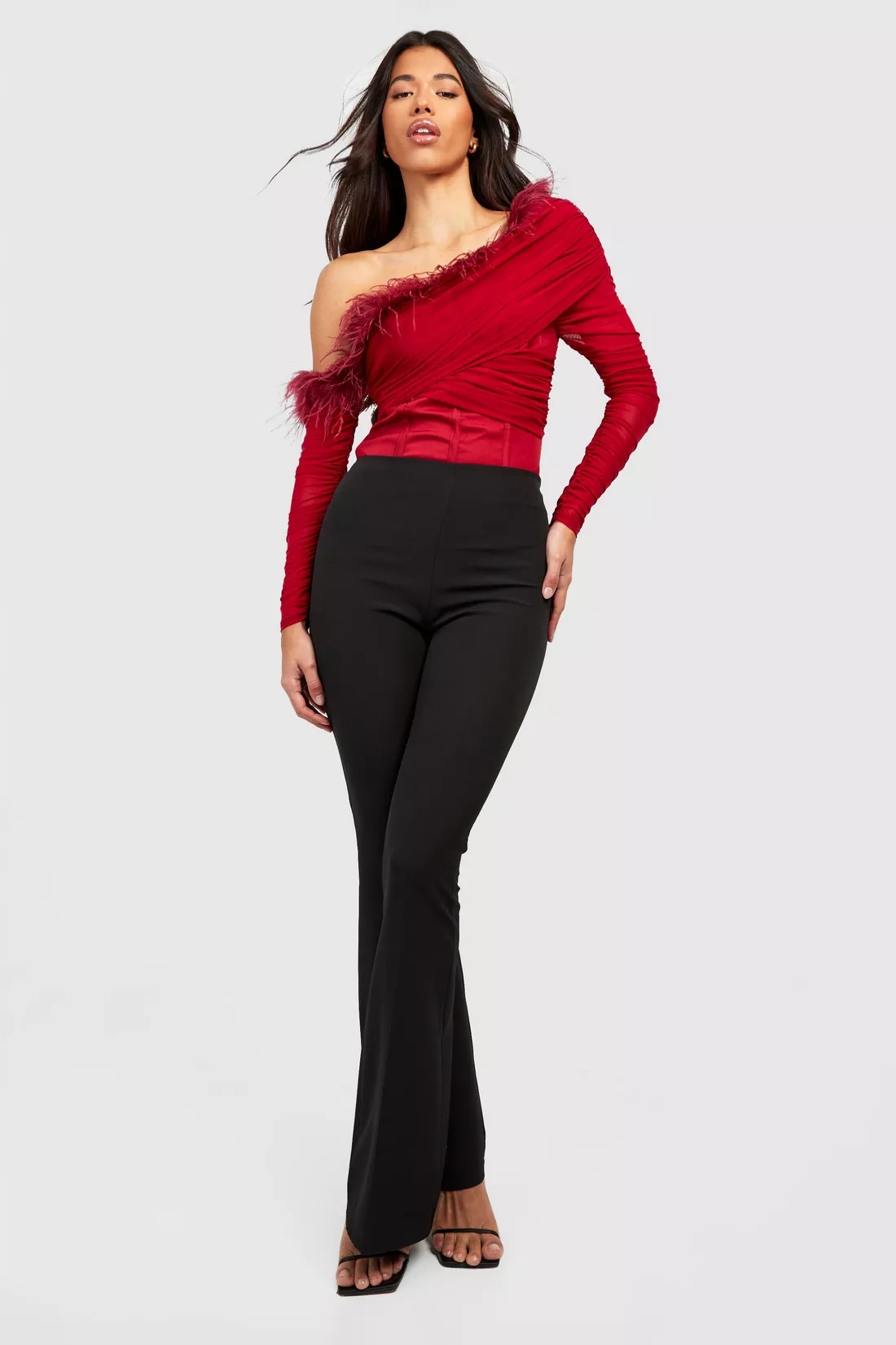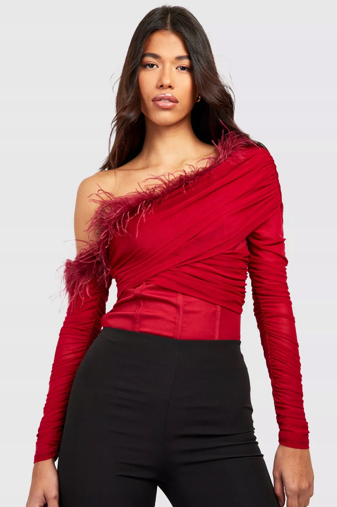 ЖЕНСКАЯ БЛУЗКА BOOHOO КРАСНАЯ, ШИФОНОВОЕ БОДИ С ПЕРЬЯМИ, ЭЛЕГАНТНЫЙ М 38