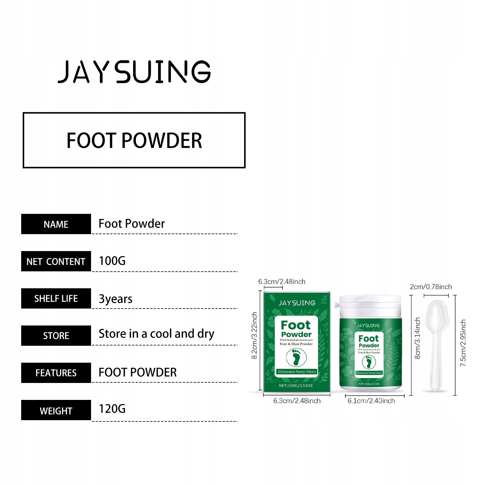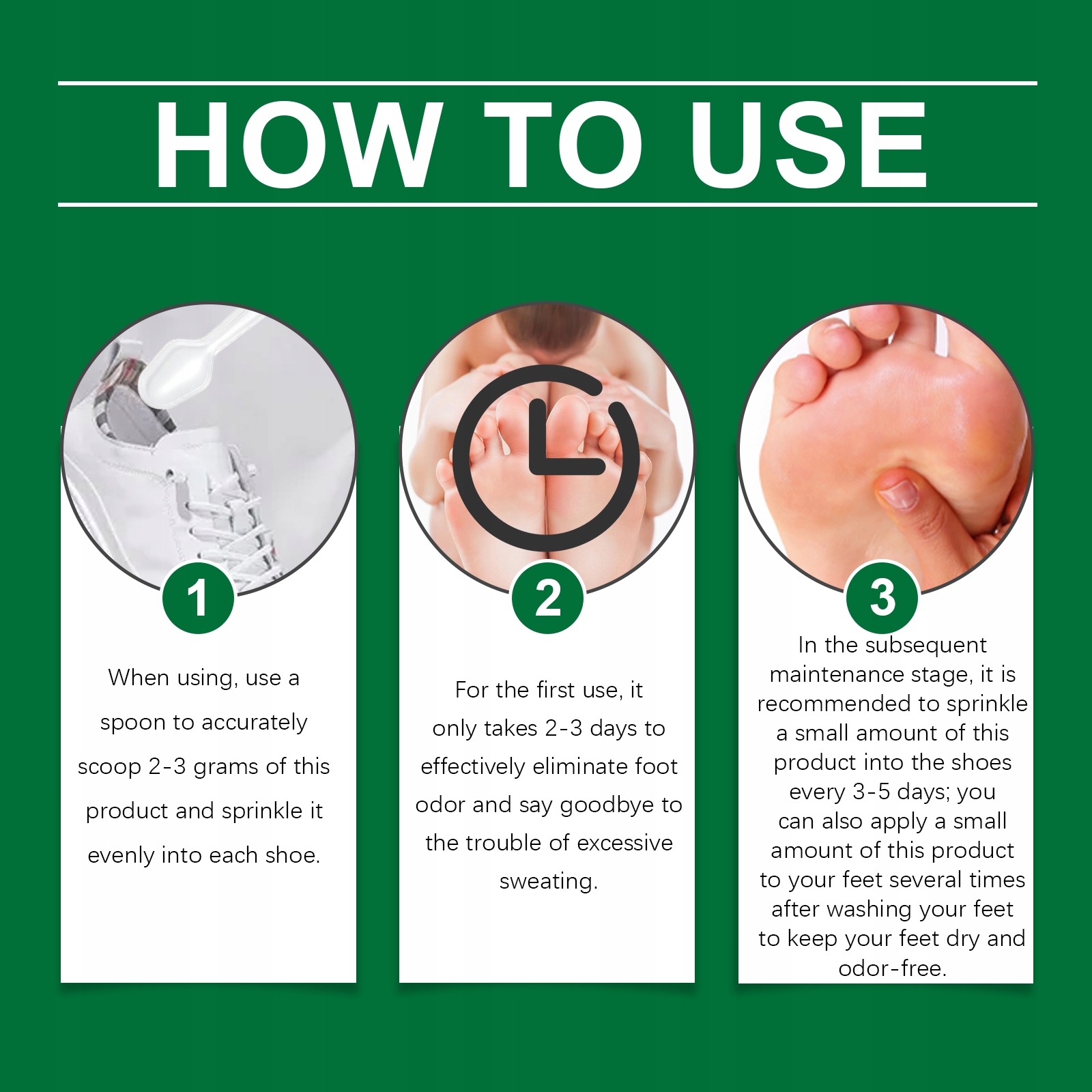 Наш ног очищающий порошок содержит кукурузный крахмал, бикарбонат натрия и разговаривает. Разработанный, чтобы быстро удалить неприятные запахи с ног и туфлей, чтобы добавить свежесть в повседневное путешествие. Он очень прост в использовании: чтобы использовать его, возьмите ровно 2-3 грамма продукта с ложкой и равномерно посыпать каждой парой обуви. Впервые только 2-3 дня достаточно, чтобы эффективно устранить неприятный запах ног и попрощаться с чрезмерным потоотделением. На более позднем этапе технического обслуживания рекомендуется залить небольшое количество продукта на обувь каждые 3-5 дней; Вы также можете нанести небольшое количество продукта на ноги несколько раз после того, как мыть их, чтобы они были сухими и без запаха. Это заставит неприятный запах немедленно исчезнуть, а ноги будут свежими и удобными.