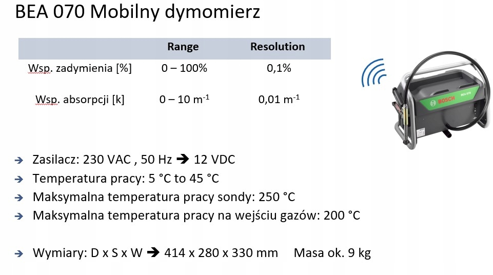 Благодаря беспроводному подключению и работе от аккумулятора (опция) он в любое время готов к точному контролю и регулированию выбросов выхлопных газов в автомобилях, работающих на бензине, газе и дизельное топливо.