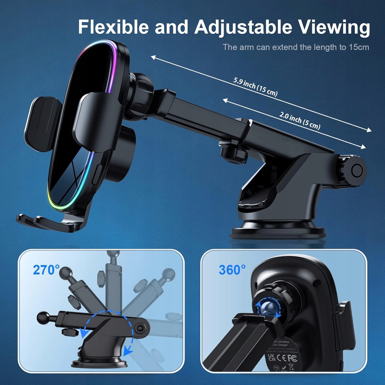 Construction 2 в 1: подключите беспроводное автомобильное зарядное устройство и держатель мобильного телефона в одном, обеспечивая быструю зарядку мобильного телефона, поэтому вам не нужно беспокоиться о кабелях и телефона во время вождения. Наше беспроводное зарядное устройство для телефона совместимо с автомобильными окнами, распределительными досками и отверстиями для вентиляции, благодаря тому, что навигация по GPS и телефонные звонки более удобны, чем когда -либо. Благодаря этому зарядному устройству водитель будет безопаснее и удобнее для ручки водителей. Идеальный рождественский подарок!