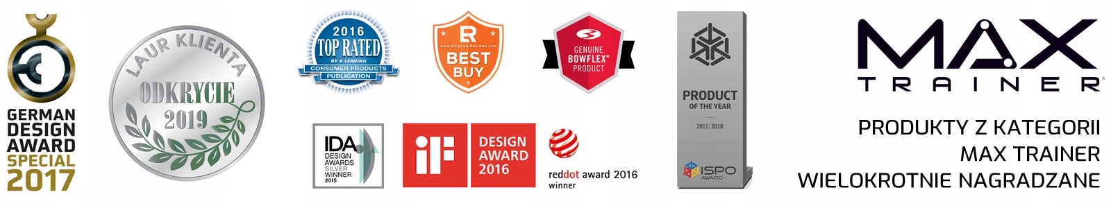 Инновации и современный дизайн продуктов из категории Max Trainer были присуждены много раз. В этом году продукты были оценены польскими пользователями и получили потребительский лавр "Discovery 2019". Они также были оценены независимыми порталами тестирования оборудования, вызывая высокие оценки для отдельных параметров. Полученные различия показывают, что оборудование является самым высоким рейтингом как специалистов, так и экспертов по оборудованию, а также любителей.