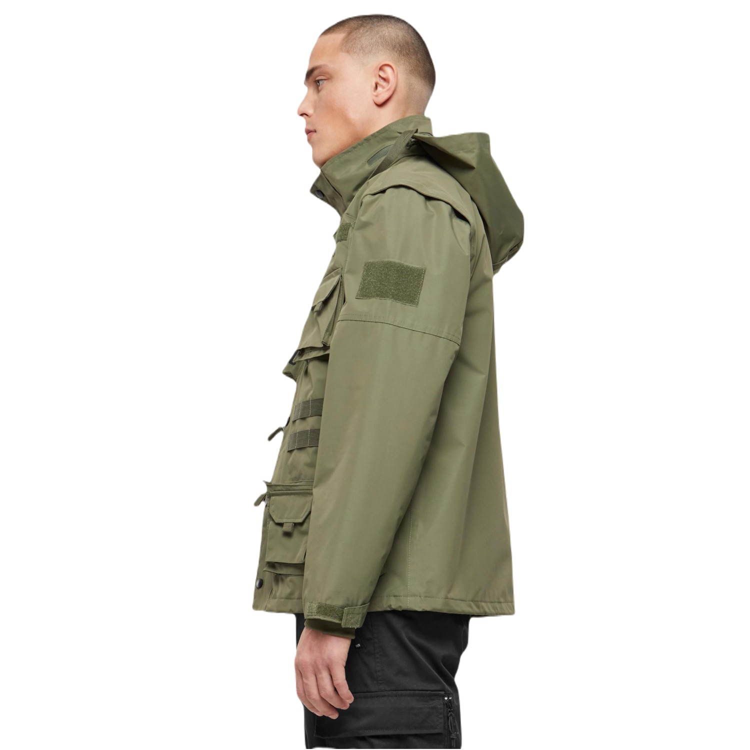 Brandit Superior - Olive (3191.1) производится 100% светового полиэстера , что делает его устойчивой к воде. водонепроницаемая куртка brandit подходит для ношения всех сезонов, и, в частности, в течение которых можно ожидать увеличения дождя. Стоит отметить, что дополнительная защита от дождя находится в капюшоне в воротнике . В более теплые дни вы можете разыграть рукава и использовать в качестве многофункционального жилета, например, на рыбе.