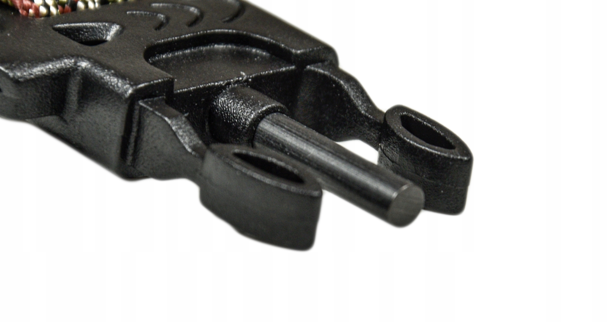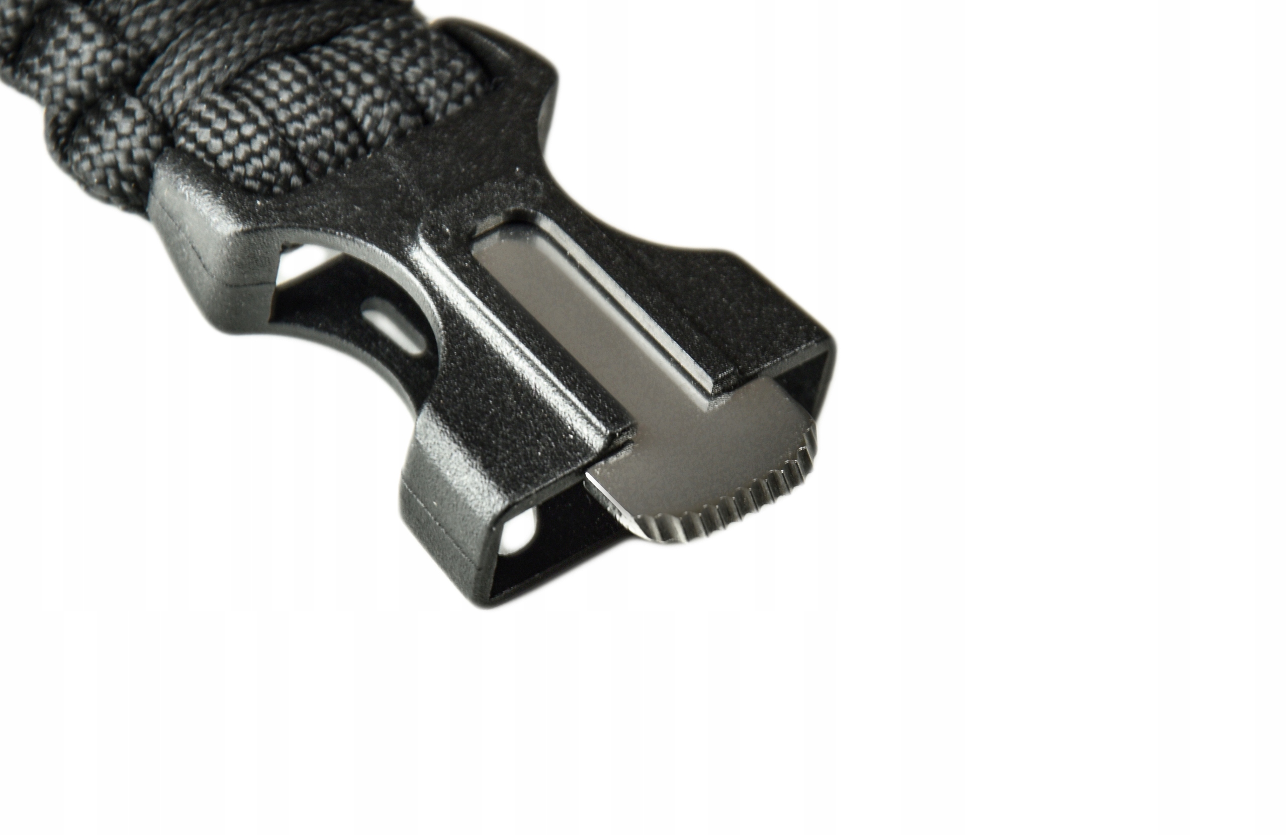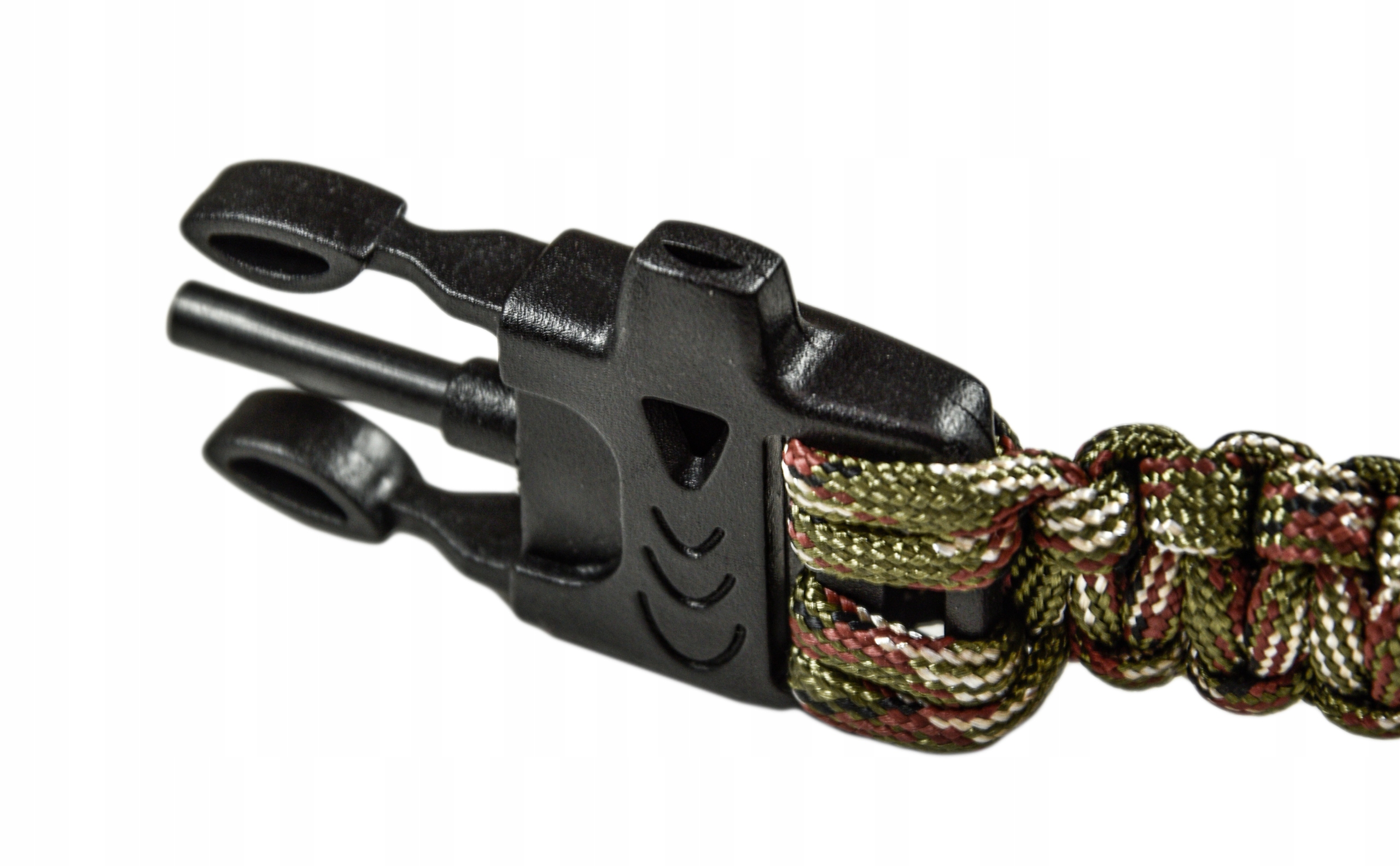 - Застежка представляет собой пряжку, оснащенную: миниатюрным ножом, магниевым зажигалкой и спасательным свистком. Расплетая браслет, получаем около 4 метров многопрядной, очень прочной веревки.
