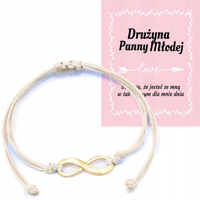 Предмет продажи - золотой браслет с подвеской в виде бесконечности + открытка с благодарностью за то, что вы пришли на девичник. К открытке также прикрепляем прозрачный полиэтиленовый пакет.