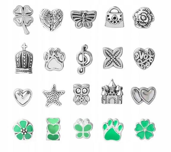 подвески и бусы: Более 60 различных подвесок и бусин, включая такие мотивы, как короны, сердца, цветы, звезды, печенье, совы, бабочки, кошки и многое другое