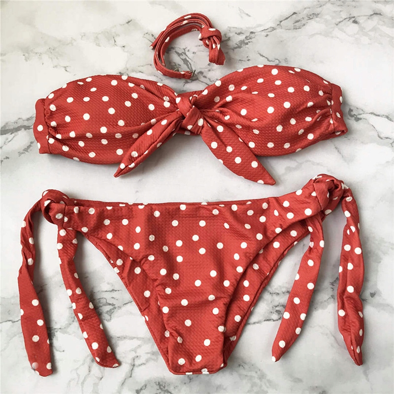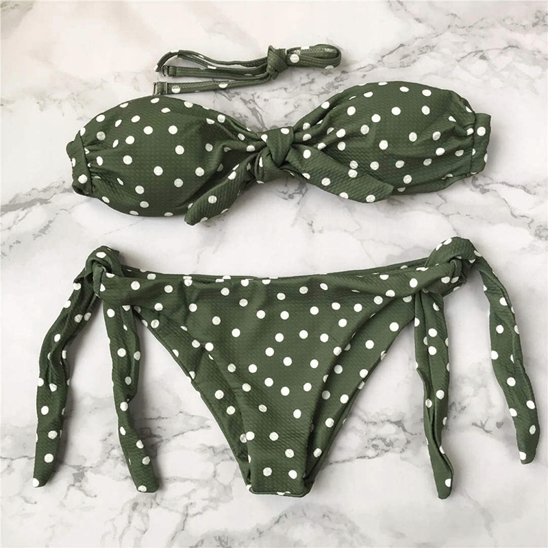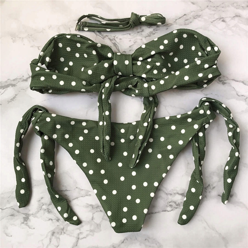 Женственный и невероятно сексуальный купальник в горошек, состоящий из топа и трусиков на завязках.