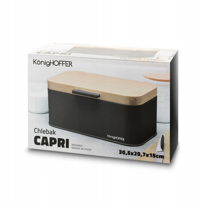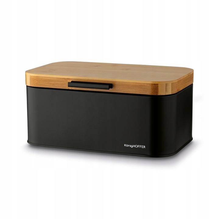 Черная хлебница Konighoffer Capri 30,5 х 18 х 14 см изготовлена из углеродистой стали. Модель имеет деревянную крышку. Он хорошо защищает содержимое от загрязнений и света. Он также обеспечивает бесплатный доступ к контенту. Застежка изготовлена из бамбука, прочная и шарнирная. Изделие имеет приятный внешний вид и вместительное. Простая форма и изящные детали добавляют элегантности. Здесь можно разместить хлеб и булочки для всей семьи. Это предложение для тех, кто ценит свежесть, хрусткость и аромат свежего хлеба и ищет прочную емкость для хлеба. Хлебницу Capri можно устойчиво разместить на кухонной стойке. Идеально подходит для маленькой кухни.