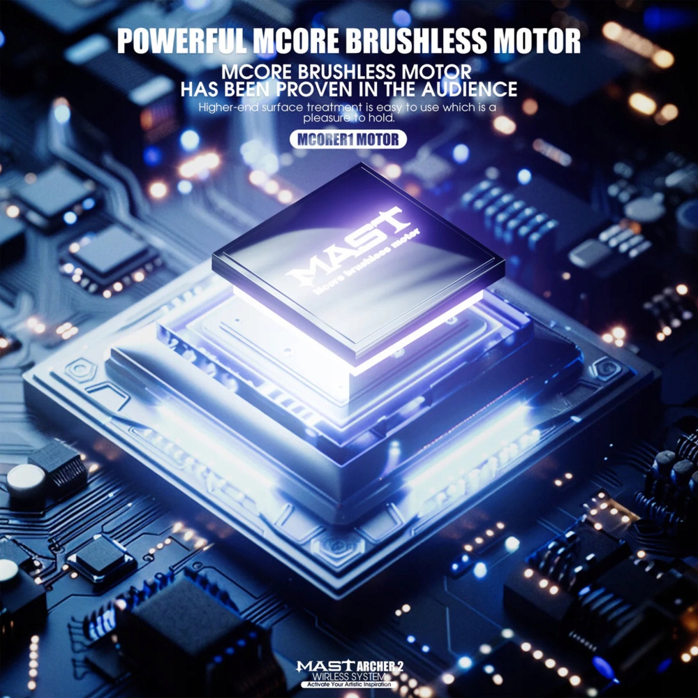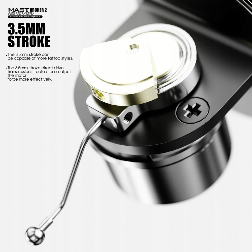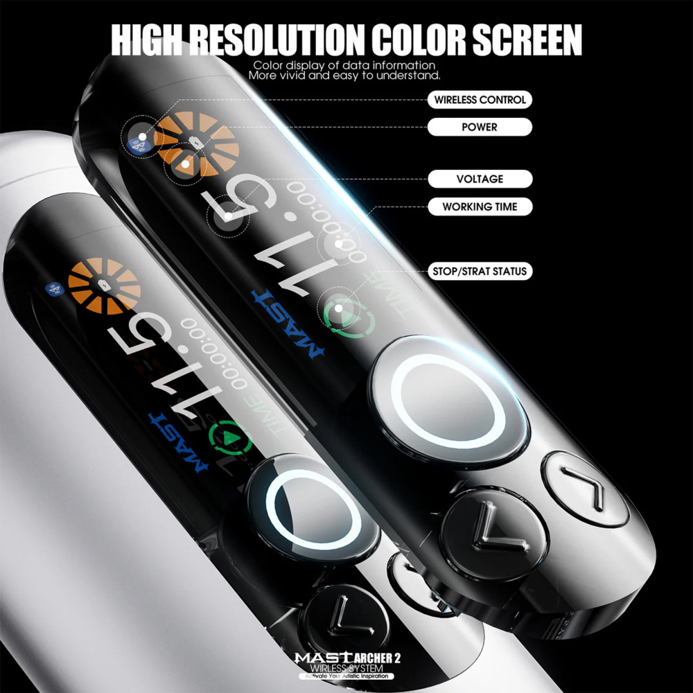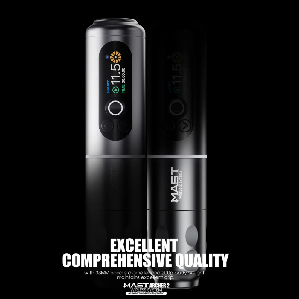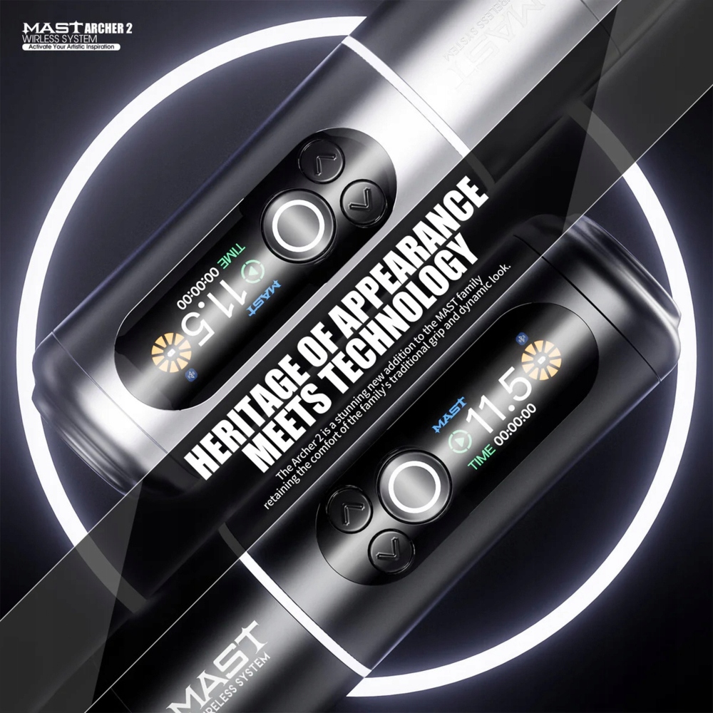Mast Archer 2 — новая модель семейства Mast, сочетающая в себе современный дизайн, эргономичную ручку и расширенную функциональность. Машина оснащена бесщеточным двигателем Mcore, аккумулятором емкостью 2000 мАч и цветным дисплеем высокого разрешения. Ход иглы 3,5 мм делает Archer 2 универсальным инструментом для любого стиля татуировки. Динамическая подсветка кнопки включения и разноцветная подсветка придают бритве современный вид, а матовая поверхность корпуса обеспечивает удобный и надежный хват.