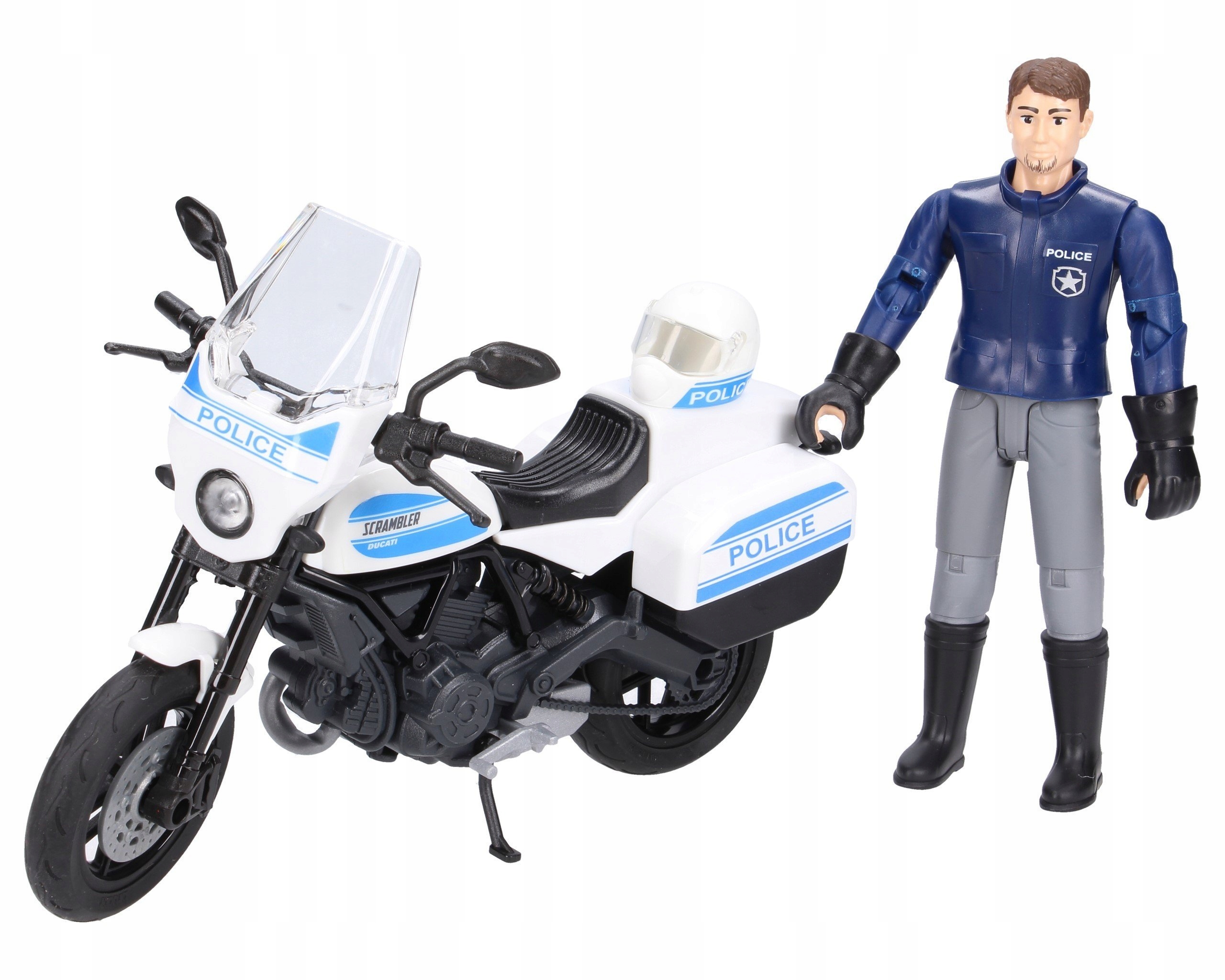 У мотоцикла есть ряд мелких деталей, которые значительно обогащают игру. Имеется поворотный руль, опускаемая подставка для ног, а задняя ось амортизируется пружиной. Игрушка оснащена мягкими резиновыми шинами с протектором. В комплект входит фигурка водителя-полицейского, у которой также есть съемный шлем и съемные перчатки. У фигурки подвижные руки, ноги и голова. Сгибаемые локти, колени, руки и бедра позволяют свободно формировать позу фигуры.