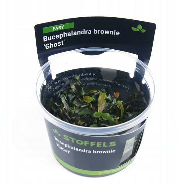 Буцефаландра Брауни 'Призрак' – редкий и востребованный сорт. Аквариумное растение с острова Борнео. Это эпифит – растение, прикрепляющееся к камням или корням в воде. Листья узкие, от темно-зеленого до коричневого цвета, с бархатистой поверхностью. Растение дает маленькие белые цветы. Это медленно растущее растение, требующее мало света и удобрений. Идеально подходит для нано-аквариумов или в качестве акцента в больших аквариумах. Это растение можно выращивать как под водой, так и над водой.