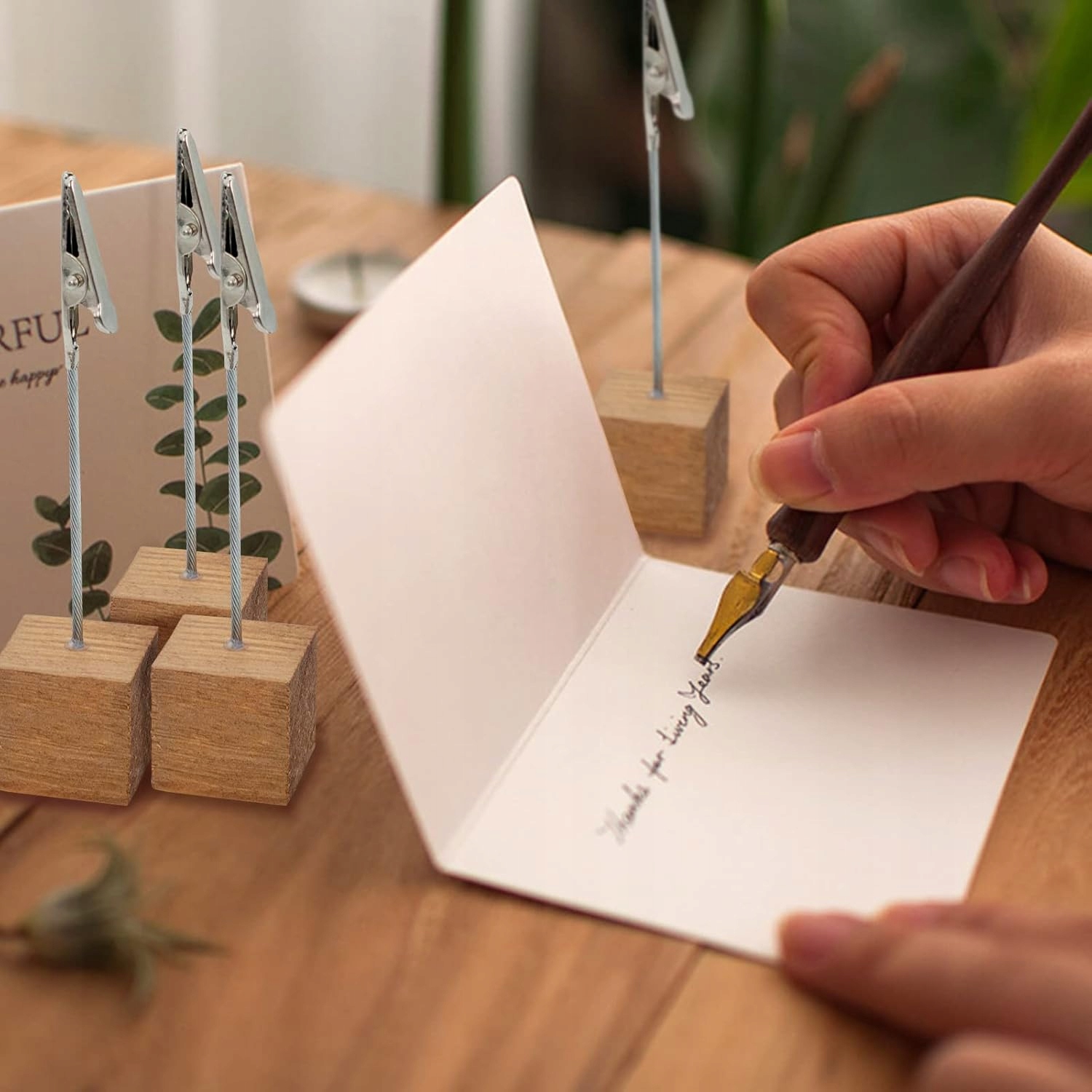 В комплект входят 12 элегантных держателей с деревянным основанием размером 2,5 см и металлической подставкой с зажимом-крокодилом высотой около 9 см. Это практичное и эстетичное решение для повседневного использования и особых случаев.