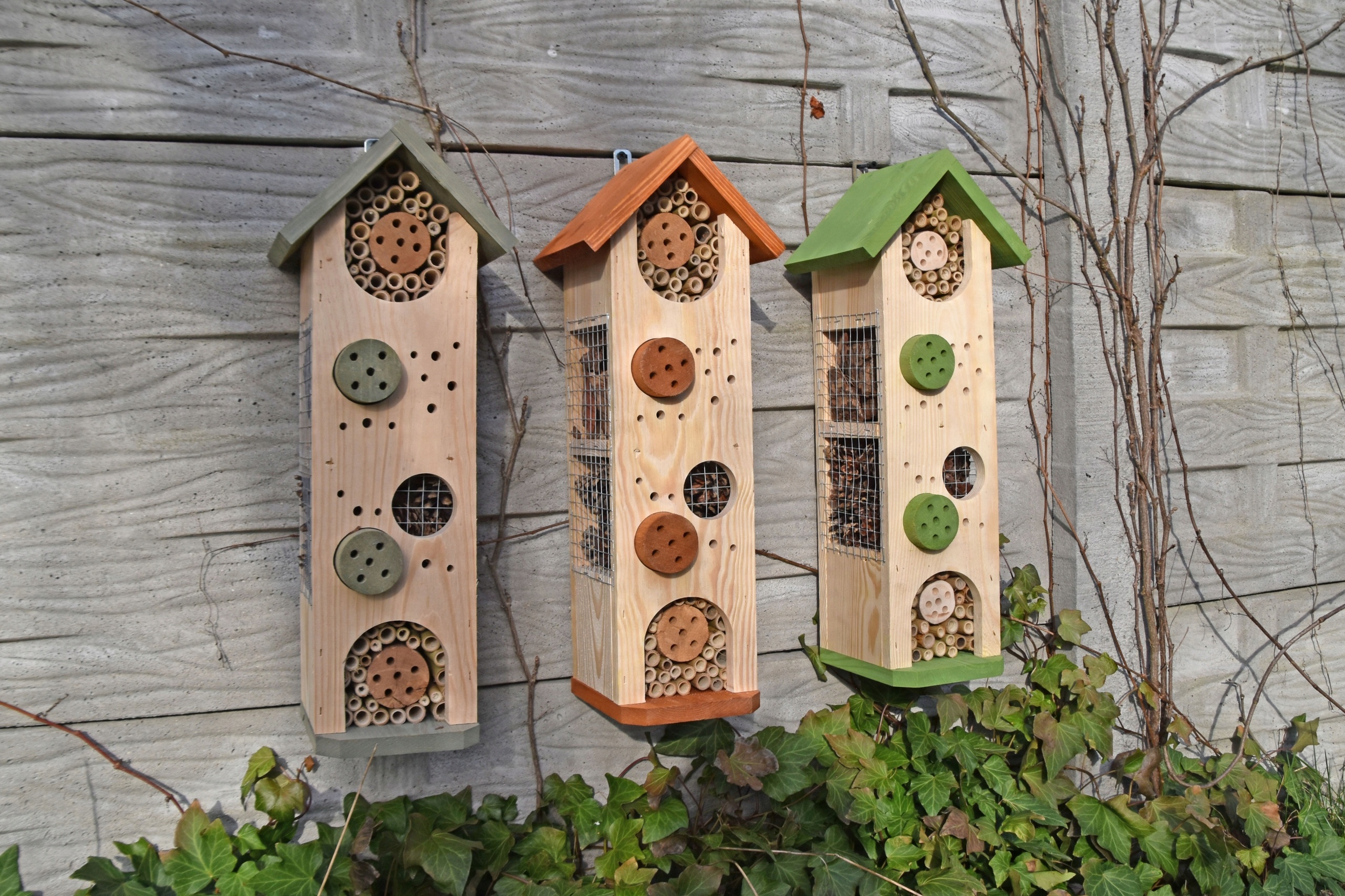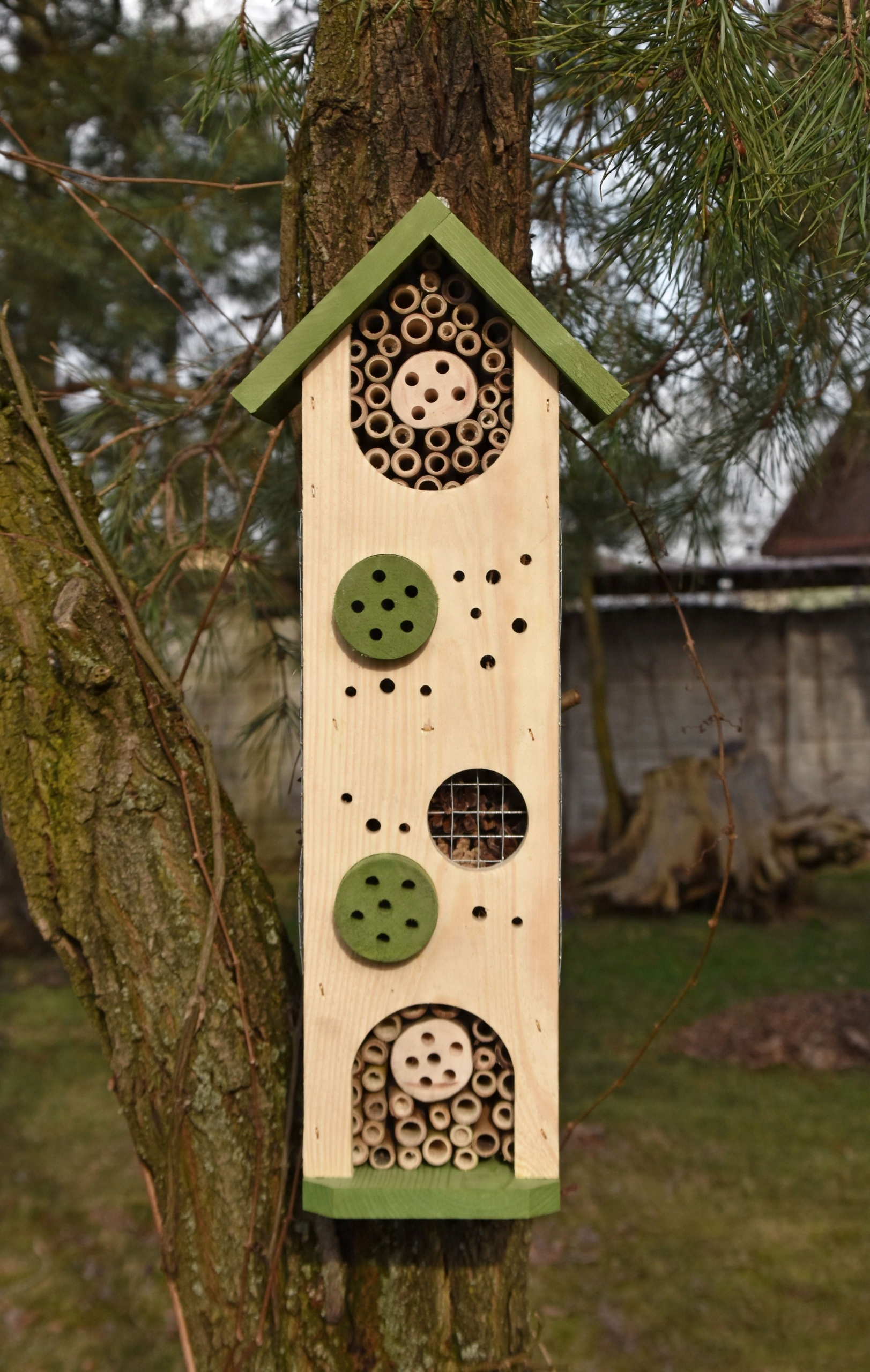 Домик/гостиница для насекомых из древесины сосны, высотой 50 см, 4 этажа и дополнительным крючком, позволяющим повесить его в любом выбранном месте.