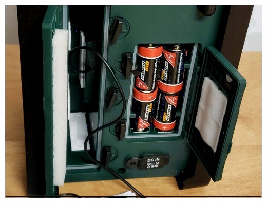 Устройство может питаться от шести батареек R14 или от адаптера переменного тока. Рядом с закрытым батарейным отсеком находится карман AUX с кабелем для подключения источника звука