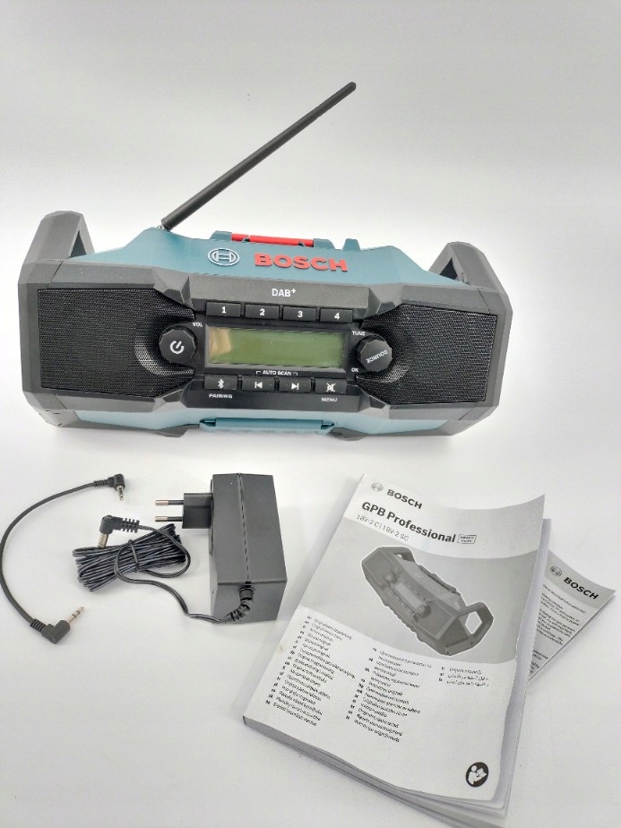GPB 18V-2 SC Professional от BOSCH — это стереорадио FM/DAB+ с двойной системой питания (от сети и аккумулятора) и разъемом AUX-IN 3,5 мм для подключения внешнего источника музыки, например MP3-плеер или телефон.