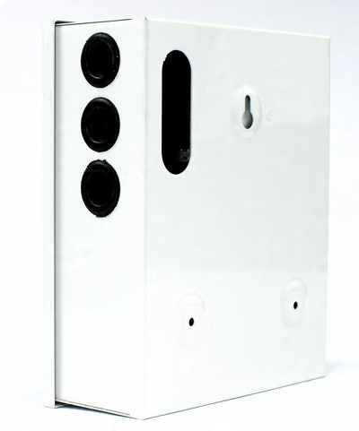 Корпус Блок питания металлический со встроенным замком (два ключа в комплекте). На задней стенке имеются монтажные отверстия и одно отверстие для кабеля большего размера. На боковой стенке имеются три отверстия для кабелей, закрытые резиновыми сальниками.