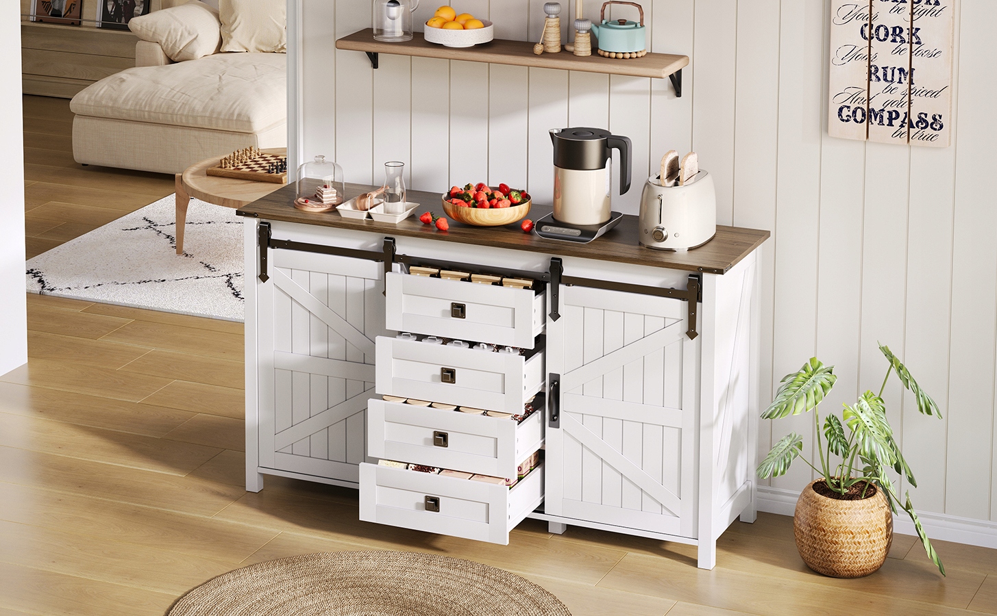 ✅ Раздвижные двери и 3 ящика: доска шириной 120 см подходит для бытовой техники, такой как кофемашина и микроволновая печь. Раздвижные двери и ящики обеспечивают достаточно места для хранения кухонной утвари, такой как тарелки, тарелки и чашки.