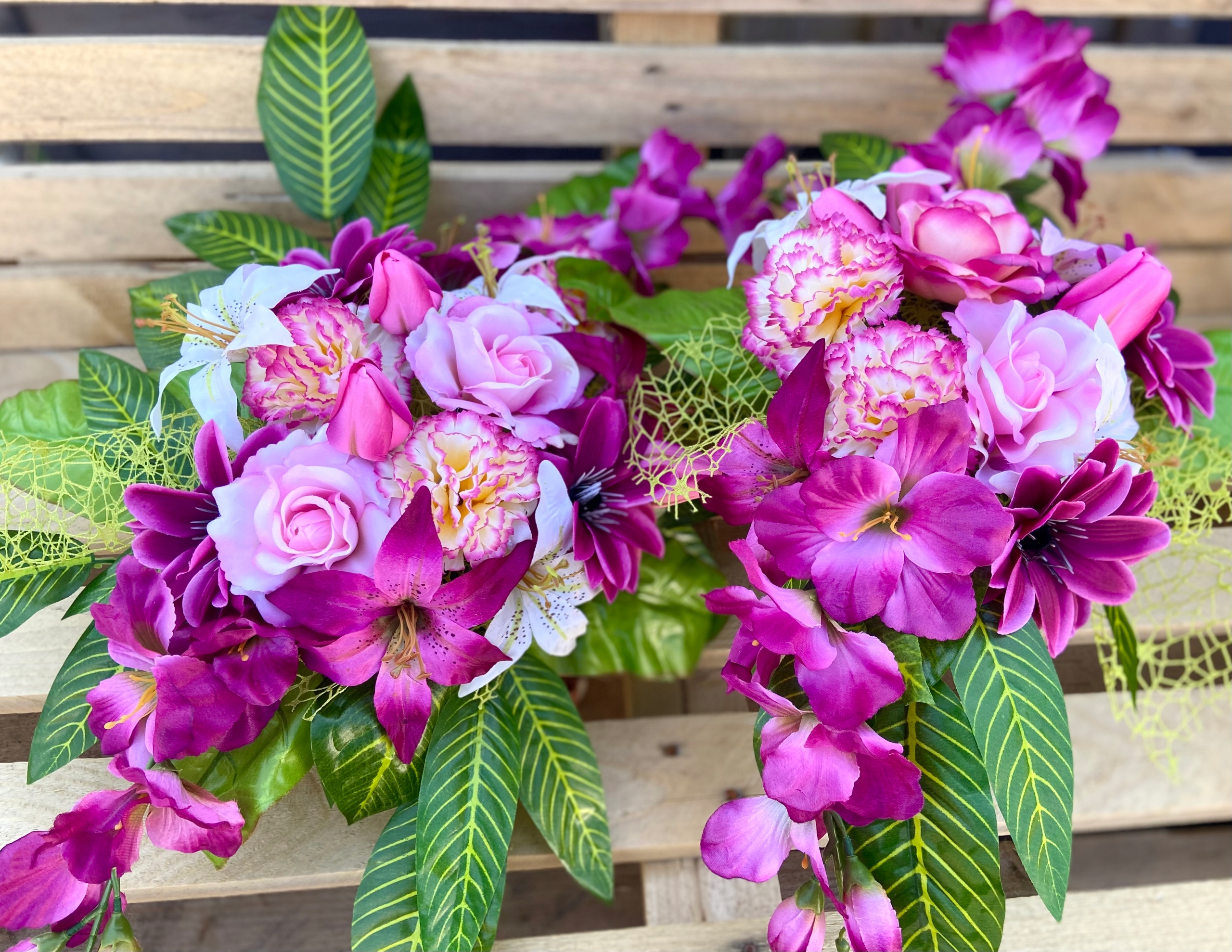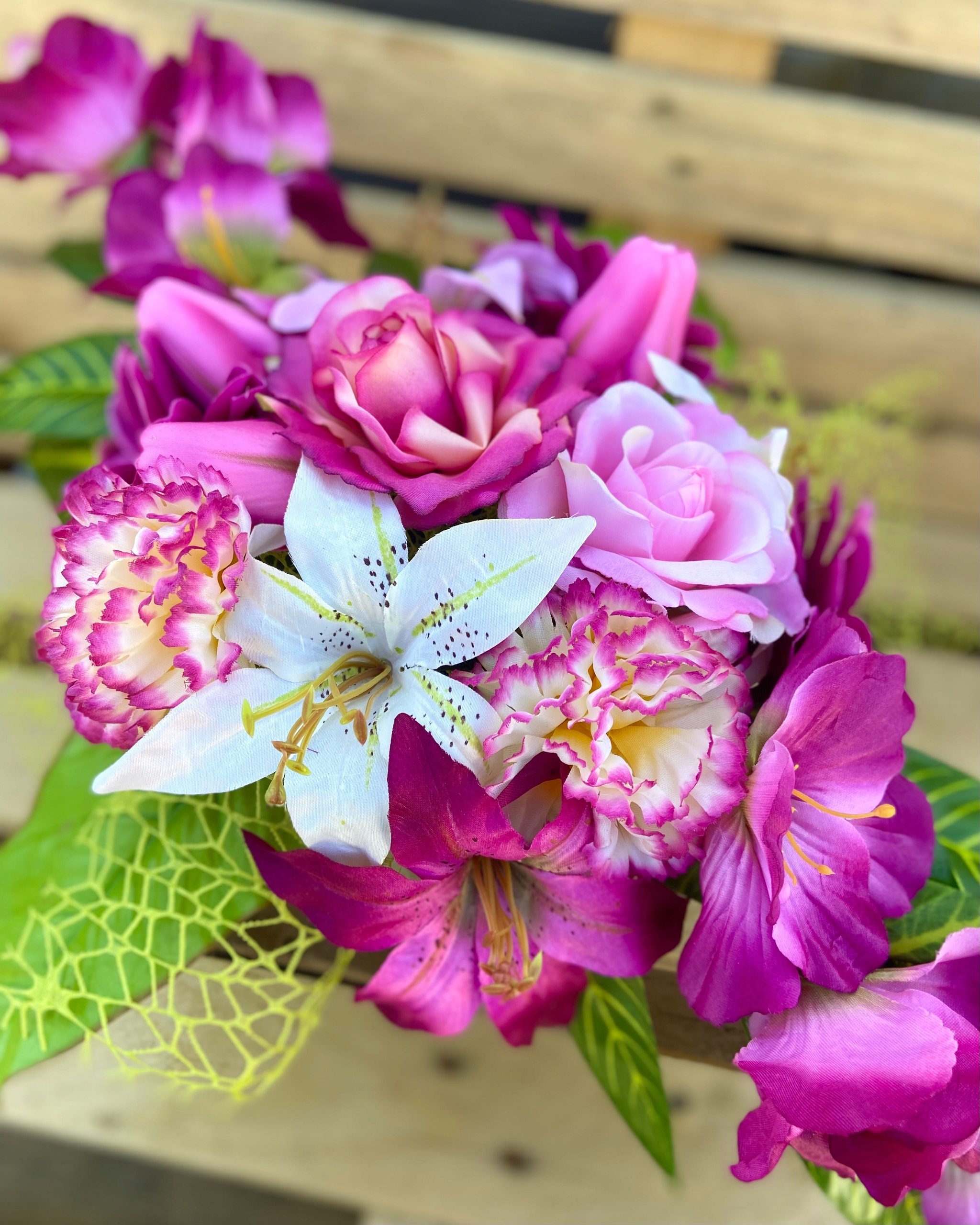 Букет и букет включают в себя большой набор красивых искусственных цветов в оттенках экрю, розового и фуксии: