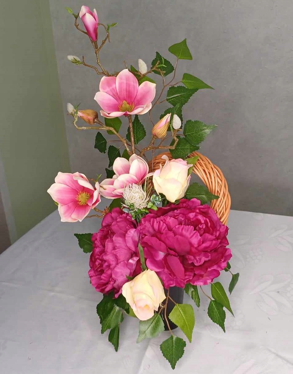 Надгробный букет, изготовленный вручную из качественных искусственных цветов в горшке, наполненном бетоном.