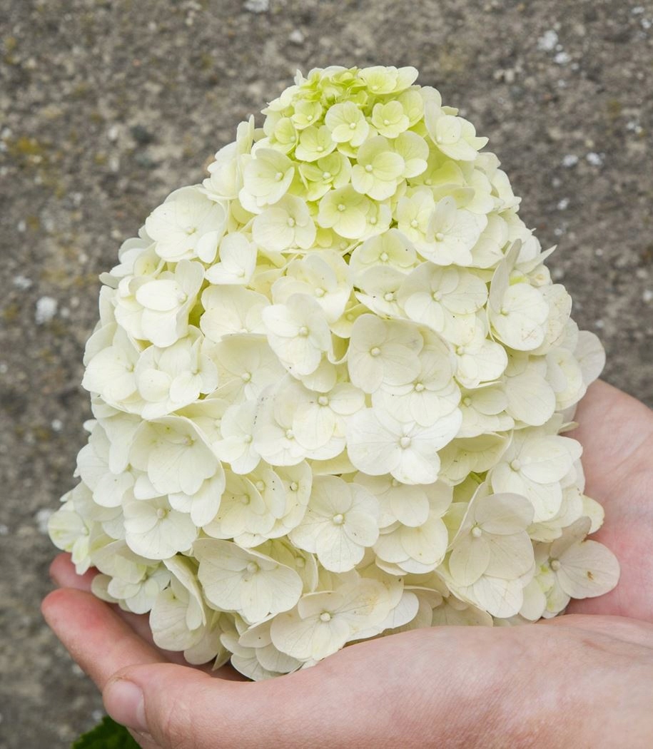 Соцветия вырастают до 25 см в длину, интенсивно-белые с изначально характерным зеленым кончиком. Цветение начинается в июле и продолжается до сентября, после распускания цветки засыхают и остаются украшением куста всю осень и зиму.
