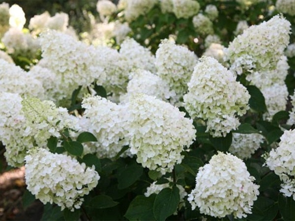 Соцветия длиной до 30 см и, в отличие от других сортов букетной гортензии, во время цветения очень поздно розовеют и долгое время остаются бело-кремовыми.