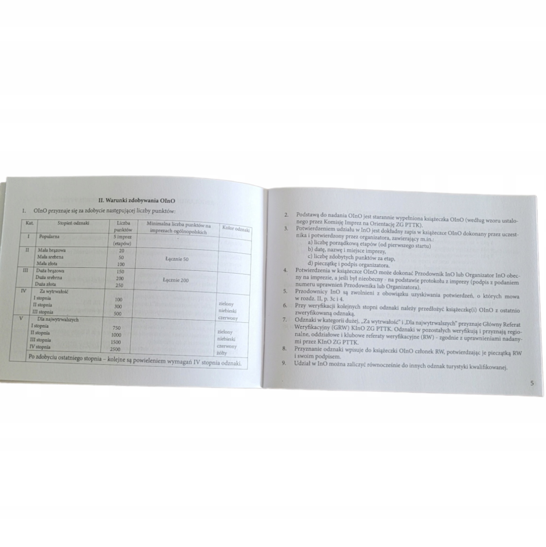 Брошюра и регламент соревнований по спортивному ориентированию являются официальной формой, выданной Комитетом ИнО ПТТК. Буклет содержит: Положение о бейджах inO и TRInO, таблицы для сбора подтверждений участия в InO и место для проверки бейджа. Необходимое снаряжение для каждого туриста, принимающего участие в мероприятиях по спортивному ориентированию.