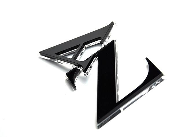 Буква изготовлена из двух слоев оргстекла, каждый толщиной 3 мм. Прозрачный и глянцевый черный цвет.