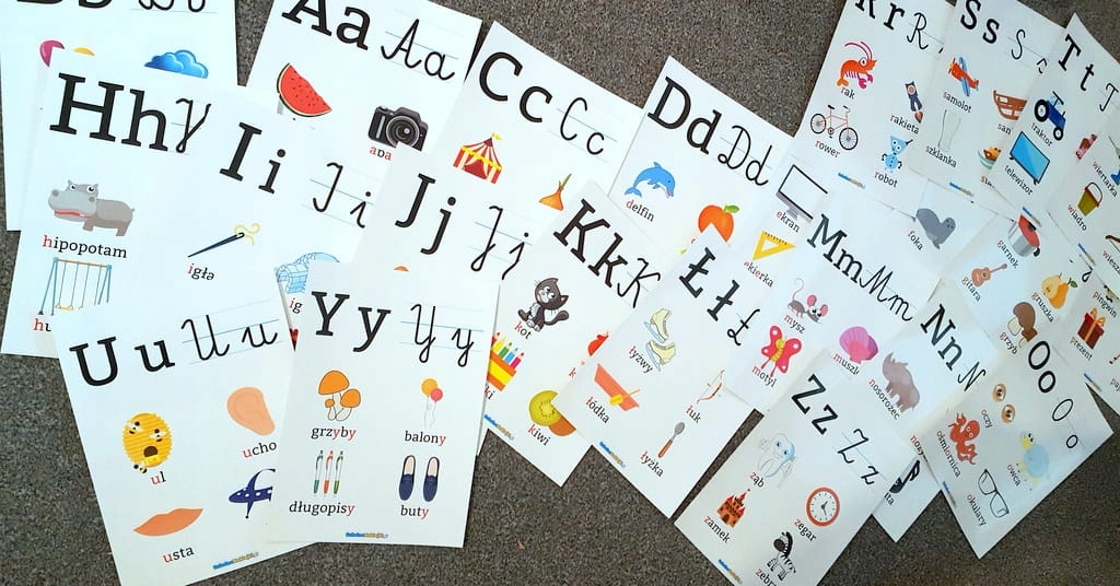 В комплект входят 24 односторонних фольгированных картона формата А4 (297мм х 210мм) с буквами польского алфавита в виде письменных и печатных букв. В набор входят следующие буквы: A, B, C, D, E, F, G, H, I, J, K, L, Ł, M, N, O, P, R, S, T, U, W. , Ю , Я