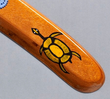 Украшения расписаны вручную в этно стиле. На рисунке изображена длинношеая черепаха (Chelodina longicollis). Это очень популярный вид черепах, обитающий в восточной части Австралии. Конечно, черепаха – одно из блюд традиционной кухни аборигенов. Его часто увековечивают в наскальных рисунках и просто рисуют на песке. На этом бумеранге мы нарисовали черепаху, ползущую к водоемам, соединенным рекой или ручьем.