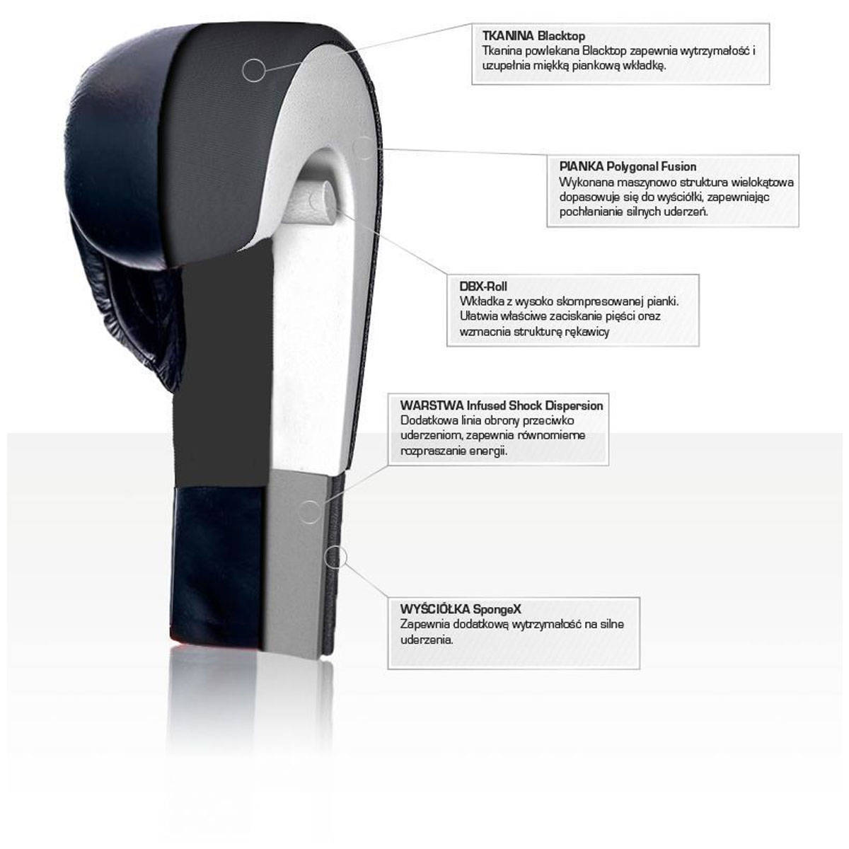 Для повышения безопасности большой палец перчатки прикреплен к перчатке с помощью ленты. Такое решение предотвращает вывих большого пальца при сильных ударах