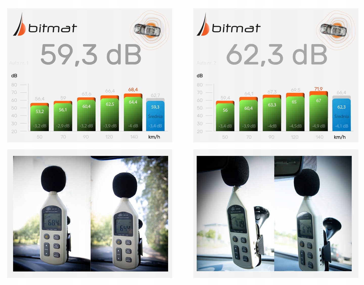 За счет шумоизоляции дверей, пола, колесных арок, багажника, крыши и капота, в зависимости от модели автомобиля, мы обычно можем снизить шум на 3-4 дБ, т.е. шум более чем на 50%.