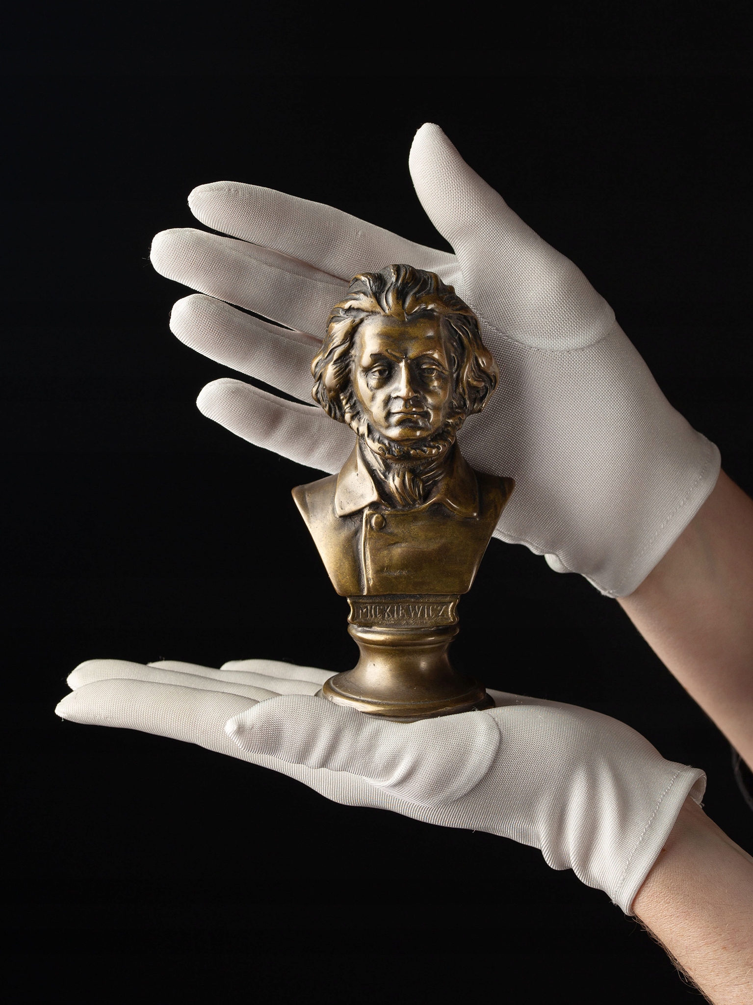Уникальная патриотическая камерная скульптура – бюст польского барда Адама Мицкевича. Небольшая кабинетная скульптура, изображающая бюст Адама Мицкевича, установленный на круглом, профилированном, арочном постаменте. Поэт изображен в элегантном пальто, из-под которого торчит шелковый галстук, обернутый вокруг шеи. Мицкевича изображали с характерными распущенными волосами и щетиной под подбородком. Лицо передано реалистично, в соответствии с известными изображениями Мицкевича. Под бюстом табличка с именем: «МИКЕВИЧ».