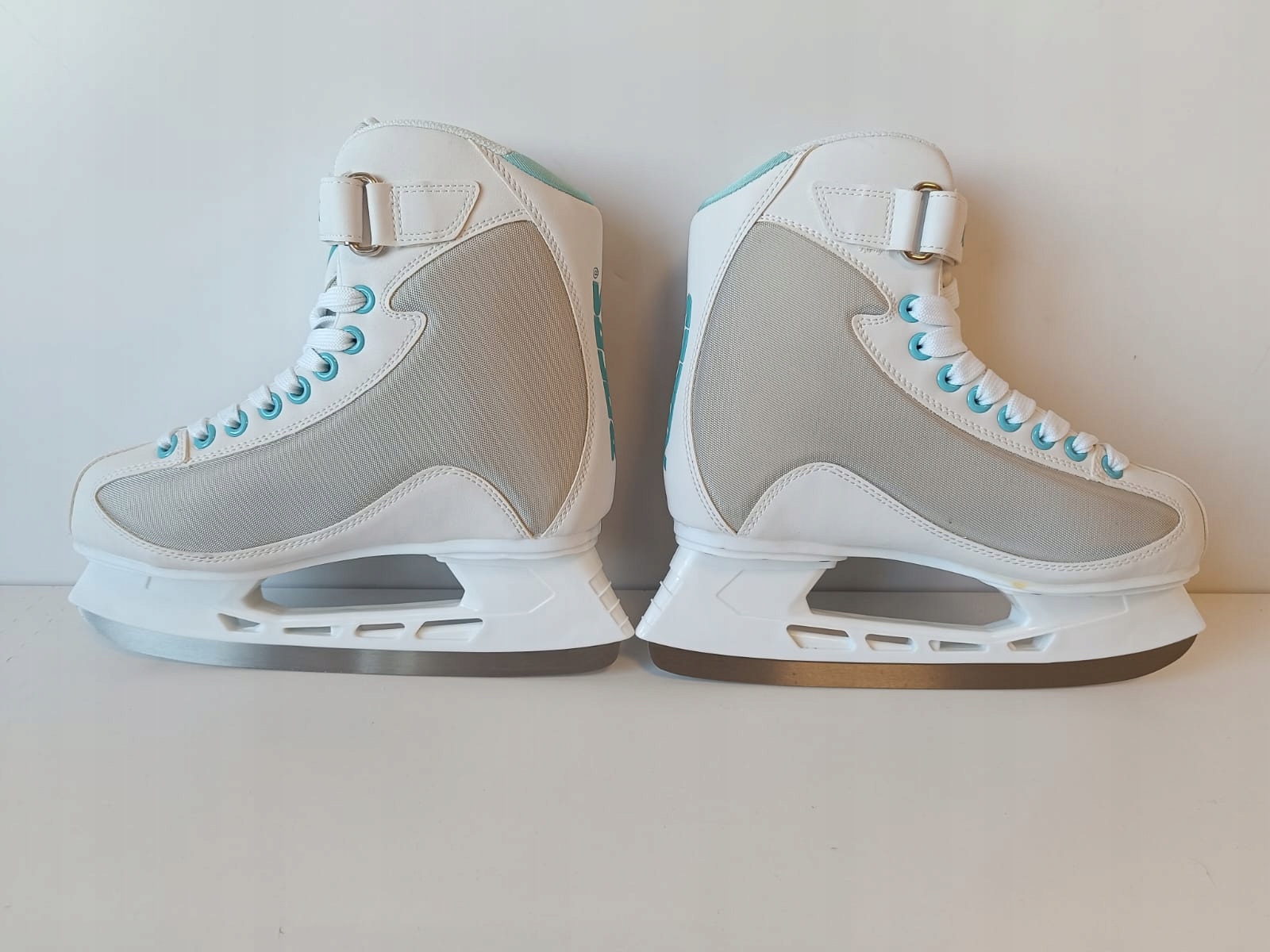 Вечные женские спортивно-развлекательные коньки в модном «бело-серебряном» хоккейном стиле. Теплоизолирующая, водонепроницаемая и устойчивая внешняя часть обуви из нейлона и синтетической кожи с усиленным носком. Подкладка и язычок специально для женщин, анатомически усилены и имеют удобную набивку. Застежка на классическую внешнюю хоккейную шнуровку с 8 петельками, белыми нитками и бирюзовыми ресницами. Дополнительно имеется ремешок на липучке в верхней части.
