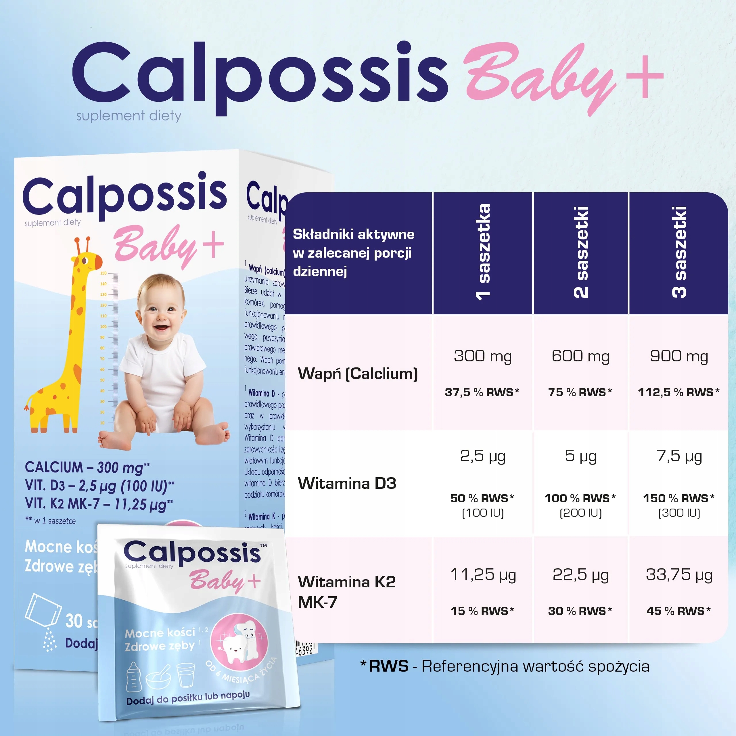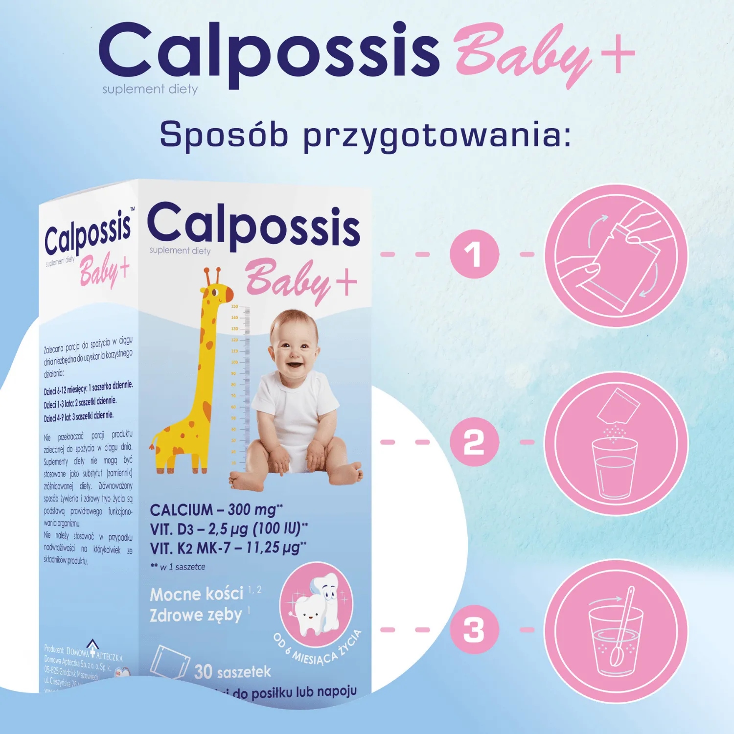 Calpossis Baby+ пищевая добавка была разработана для детей в возрасте 6 месяцев. Продукт не содержит консервантов, а удобная форма саше позволяет легко добавлять в еду или напиток, что делает его простым в повседневном использовании. Благодаря содержанию кальция, витамина D3 и витамина K2 MK-7 поддерживает правильное развитие костей и зубов, при этом заботясь о других ключевых функциях организма.