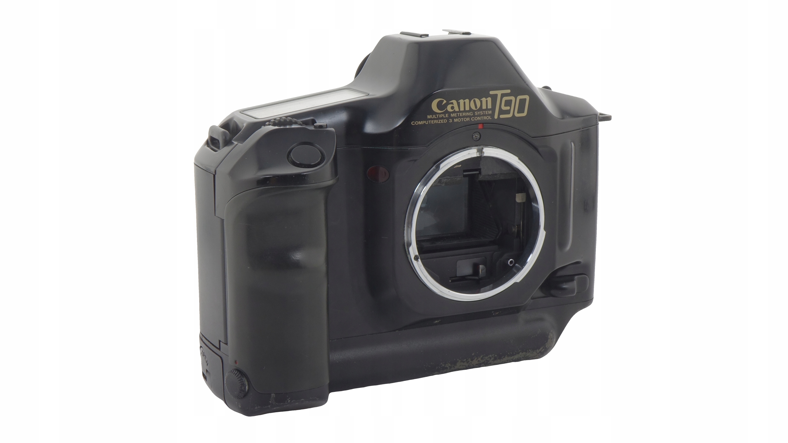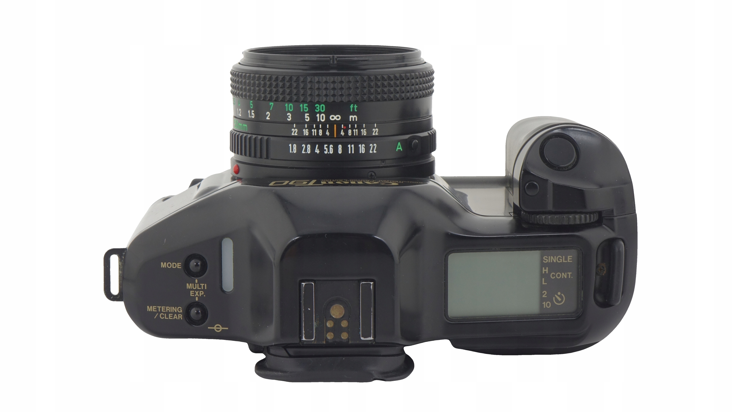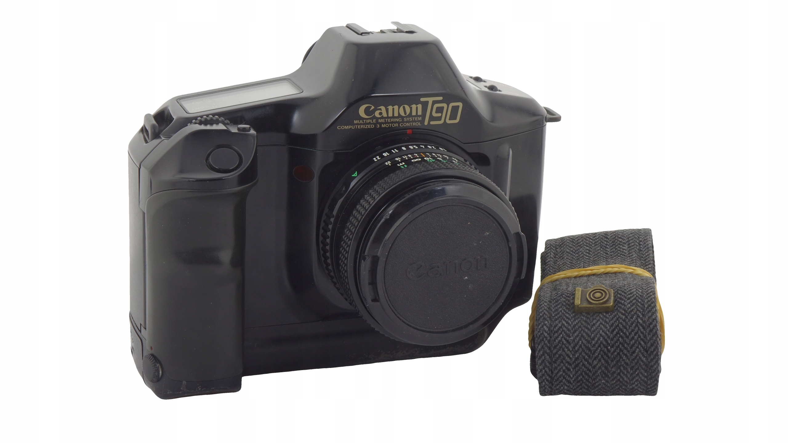 canon t90 -максимальная канона с лон -классом из серии T, характеризуемой дизайном прорыва и функциями, которая стала основой всех современных Single -lens SLRS. Он содержит ЖК -панель, установленную сверху с пиктографическим представлением многих режимов измерения, множество режимов выставок, скорости затвора, апертурой и других настроек. ViewFinder содержал 7-сегментный светодиодный дисплей, показывающий информацию о времени открытия затвора и апертуры, а также 3-сегментный светодиодный дисплей с отображением информации о блокировании и измерении AE. Камера может автоматически заряжать фильм, а также прочитать информацию о коде DX с консервированной банкой.