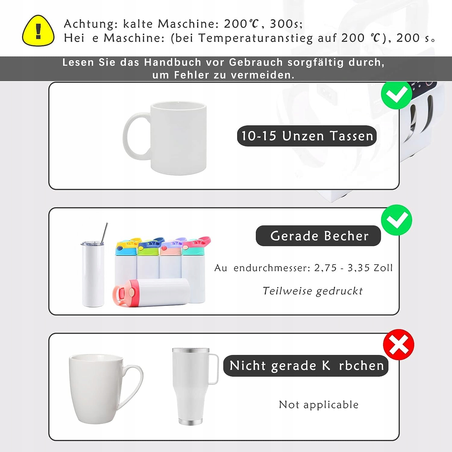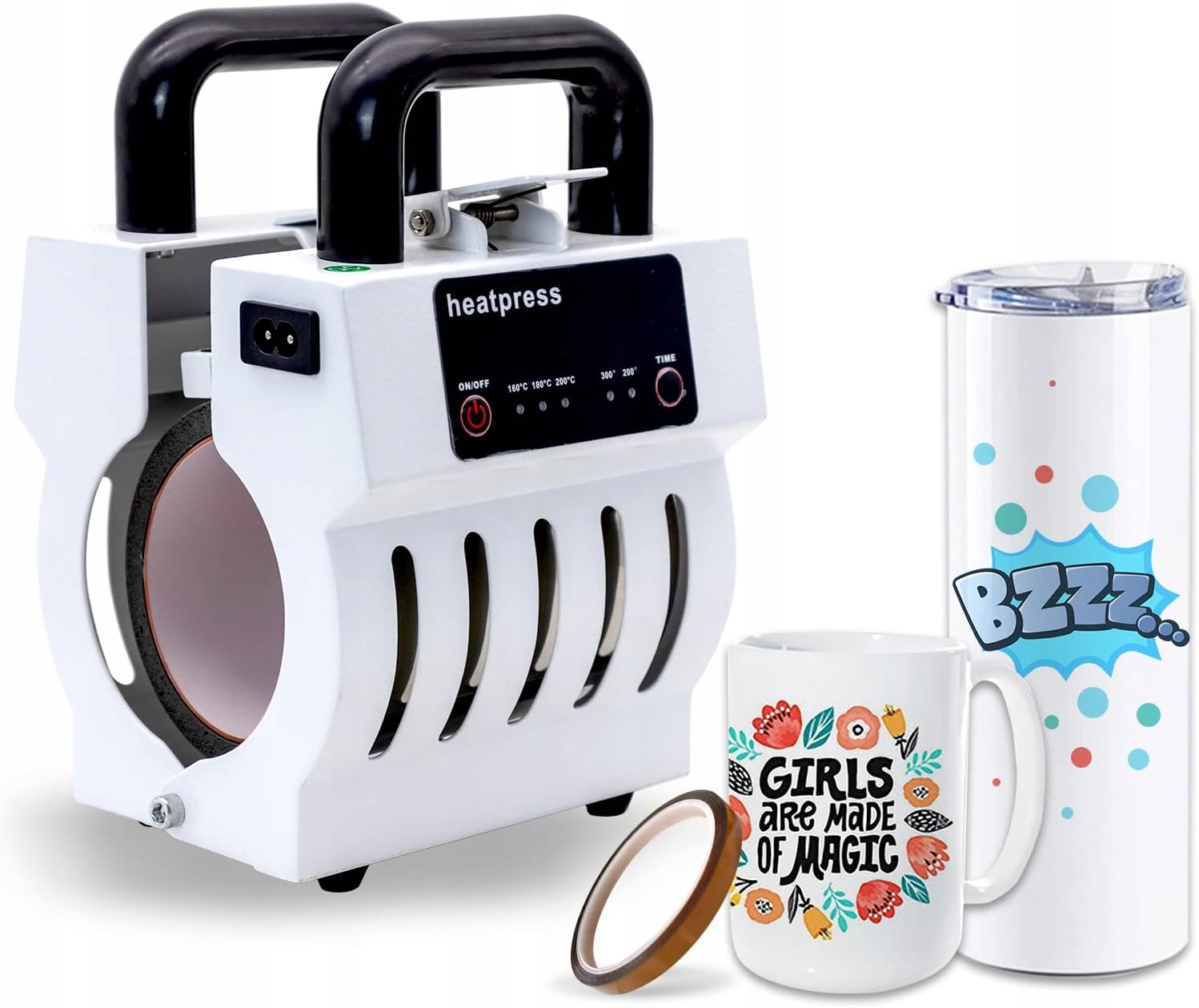 <ул>Регулирование температуры и установка времени: пресс для кружки с трехступенчатым контролем температуры: 160°C (320°F), 180°C (356°F), 200°C (392°F). Двухступенчатый контроль времени: 200С, 300С.