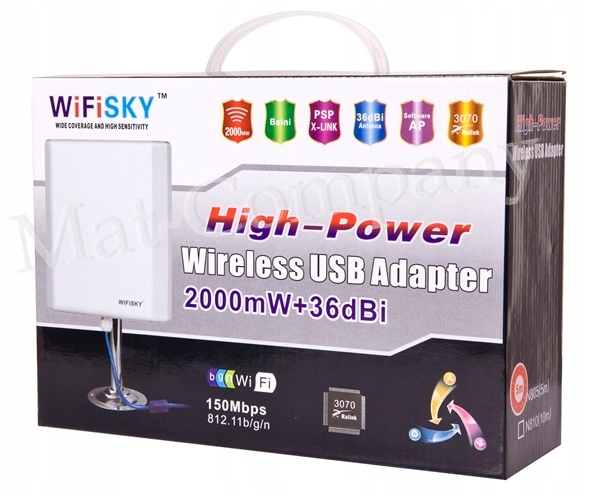 Предлагаемая антенна основана на новом чипсете Ralink RT3070 150 Мбит/с — выходная мощность карты составляет 2000 мВт благодаря встроенной антенне SKY 36dBi WiFi, что позволяет осуществлять даже очень удаленные соединения.