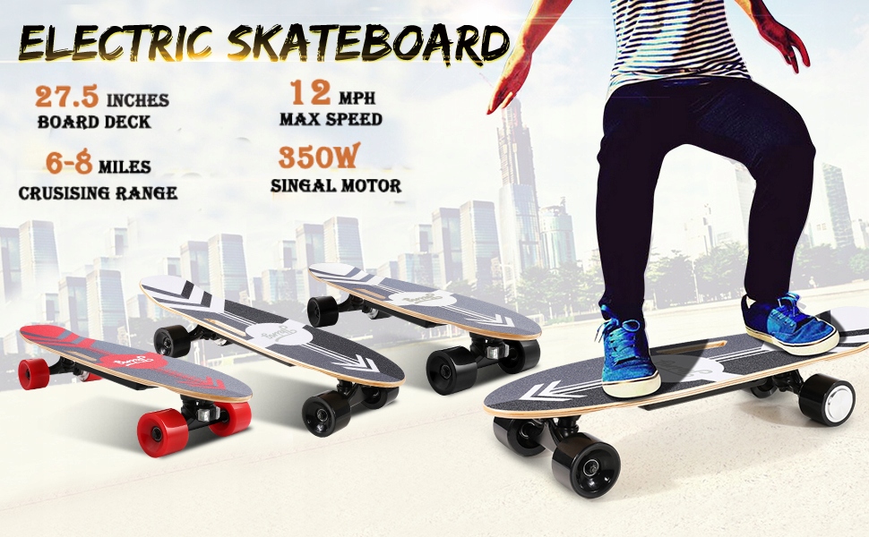 【Беспроводной пульт дистанционного управления】 Предоставьте беспроводной пульт дистанционного управления 2,4 ГГц, который может управлять движением вперед, назад, ускорения и ингибирования электрического скейтборда. Используя пульт дистанционного управления, вы также можете выбрать 3 различных режима скорости: низкая скорость (6,2 мили в час), средняя скорость (9,3 мили в час) и высокая скорость (12,4 мили в час). Кроме того, пульт дистанционного управления имеет светодиодные индикаторы, которые сообщают вам о уровне зарядки батареи скейтборда. Он не будет деформировать даже при повторном воздействии, он является твердым и долговечным, подходит для повседневного использования начинающих и профессиональными игроками