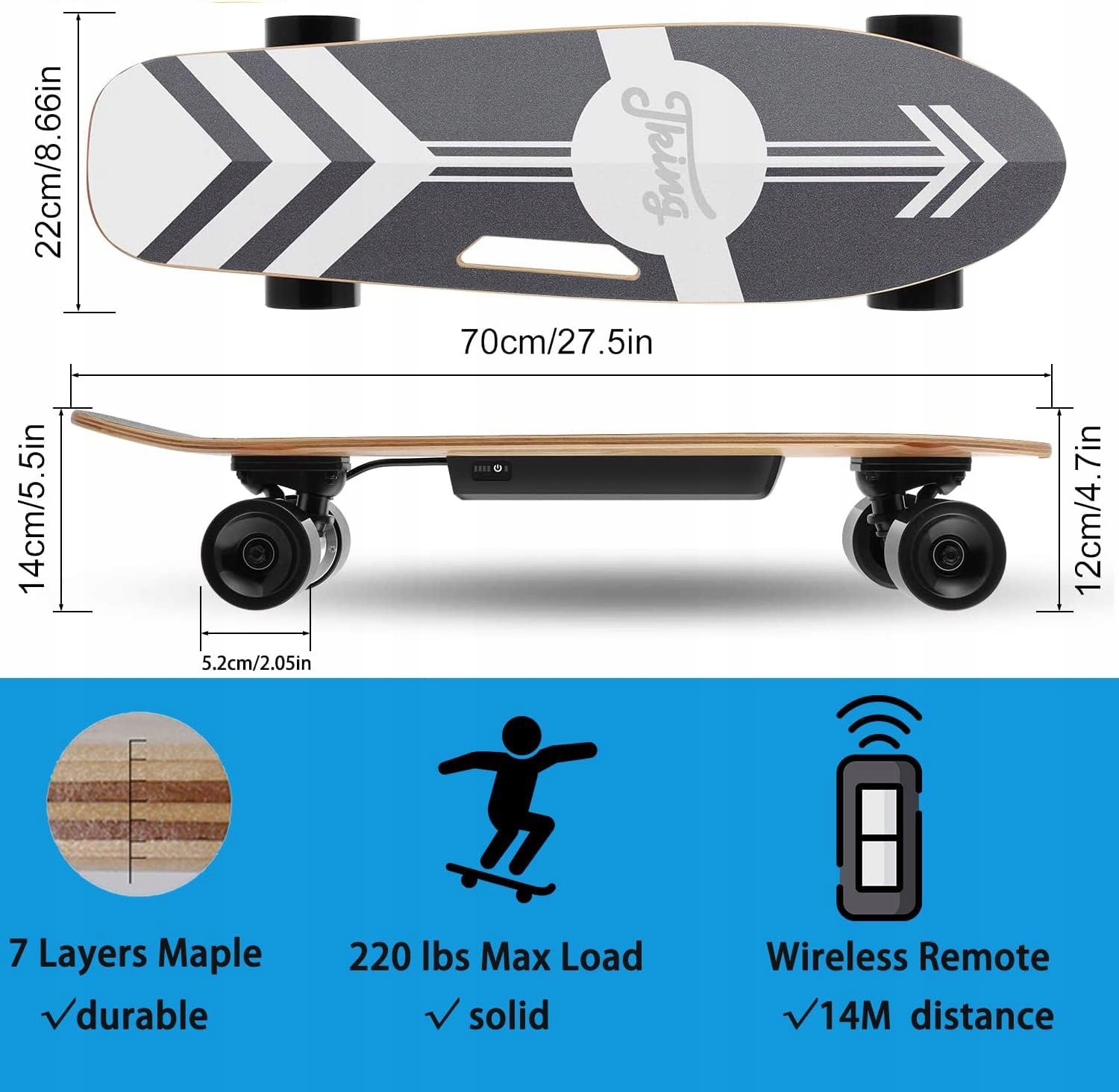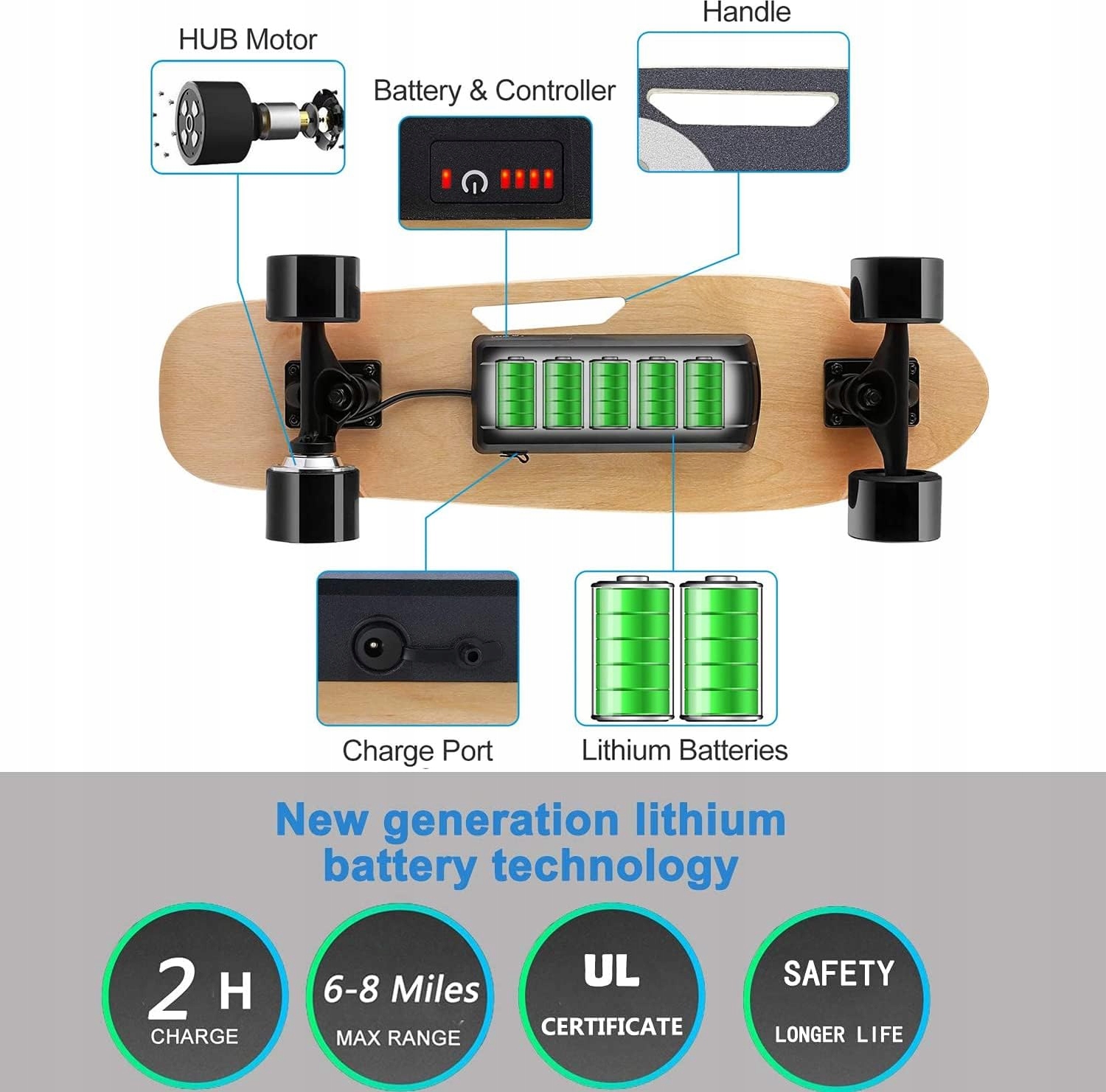 【350 Вт бесщеточный двигатель】 безмолковой двигатель с высокой бесщешностью с 350 Вт -концентратором имеет мощную движущую силу и может обеспечить сверхбыструю скорость 20,4 мили в час. Кроме того, бесщеточный двигатель Hub также может сделать электрический скейтборд более стабильным и простым в управлении, что подходит для начинающих и профессиональных энтузиастов скейтборда. Дома и супермаркет. Не беспокойтесь о том, что аккумулятор будет разряжаться, она может быть полностью заряжена в течение 2 часов, что значительно сокращает ненужное время зарядки